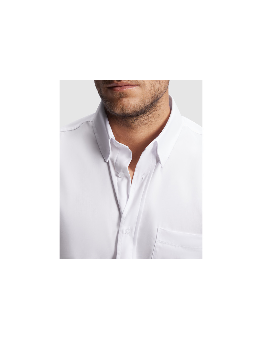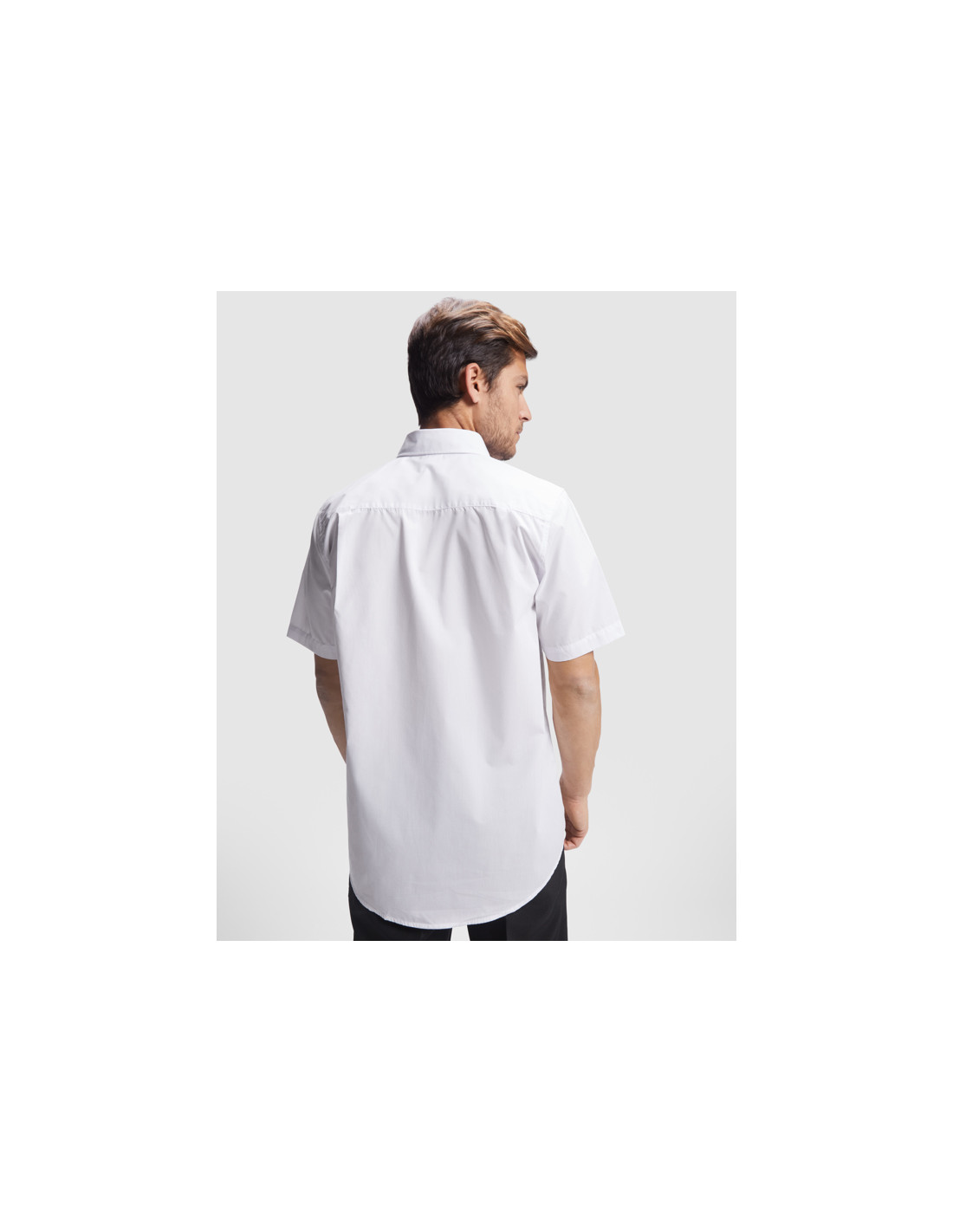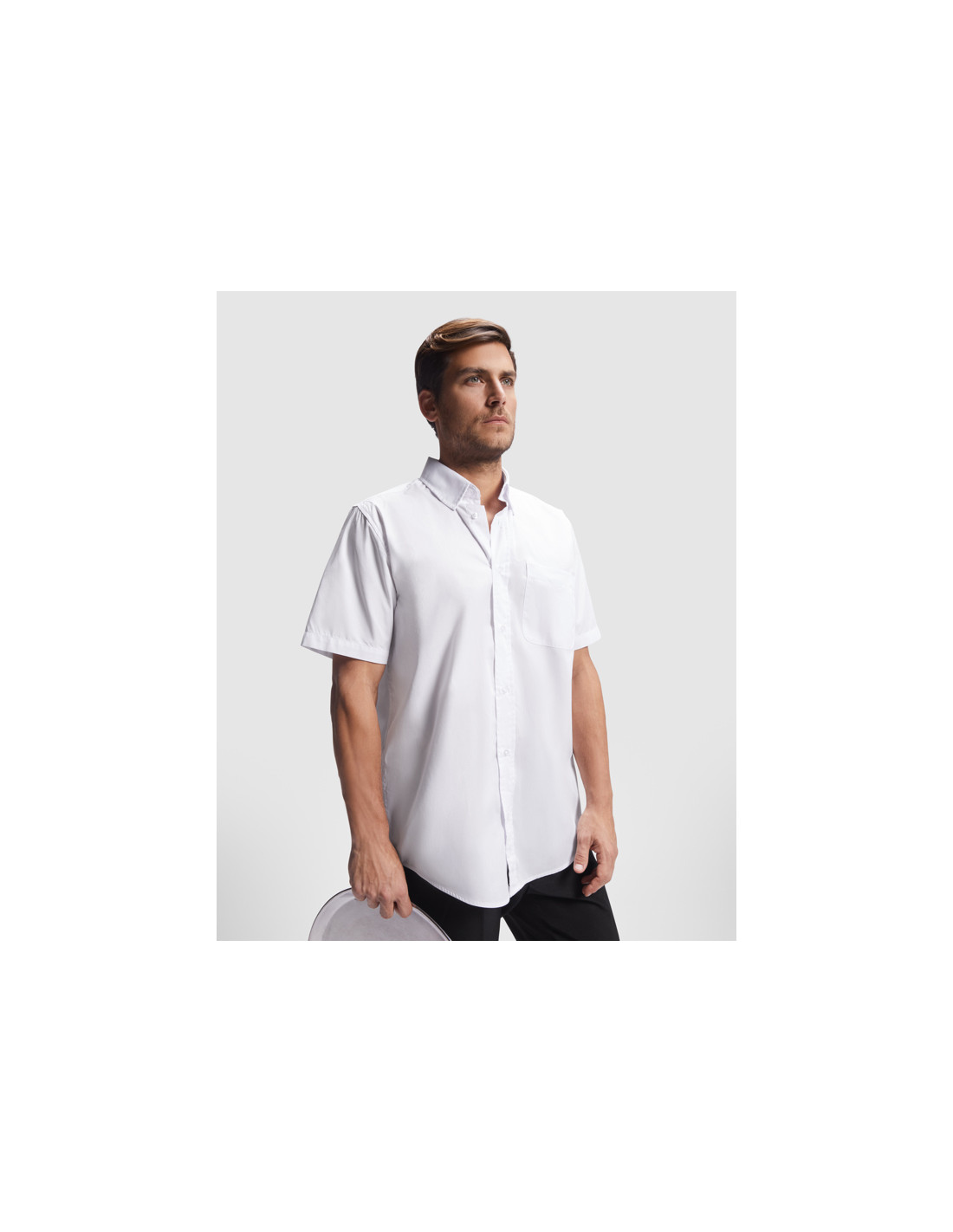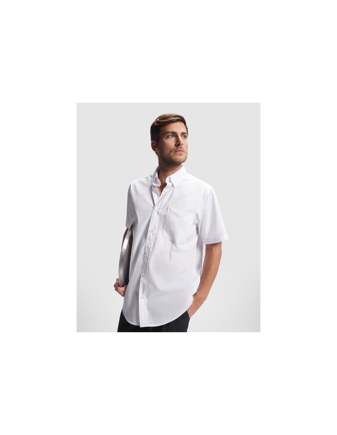 Camisa de manga corta para hombre con cuello clásico almidonado, bolsillo frontal y tapeta de 7 botones. Diseño elegante y de fácil cuidado.