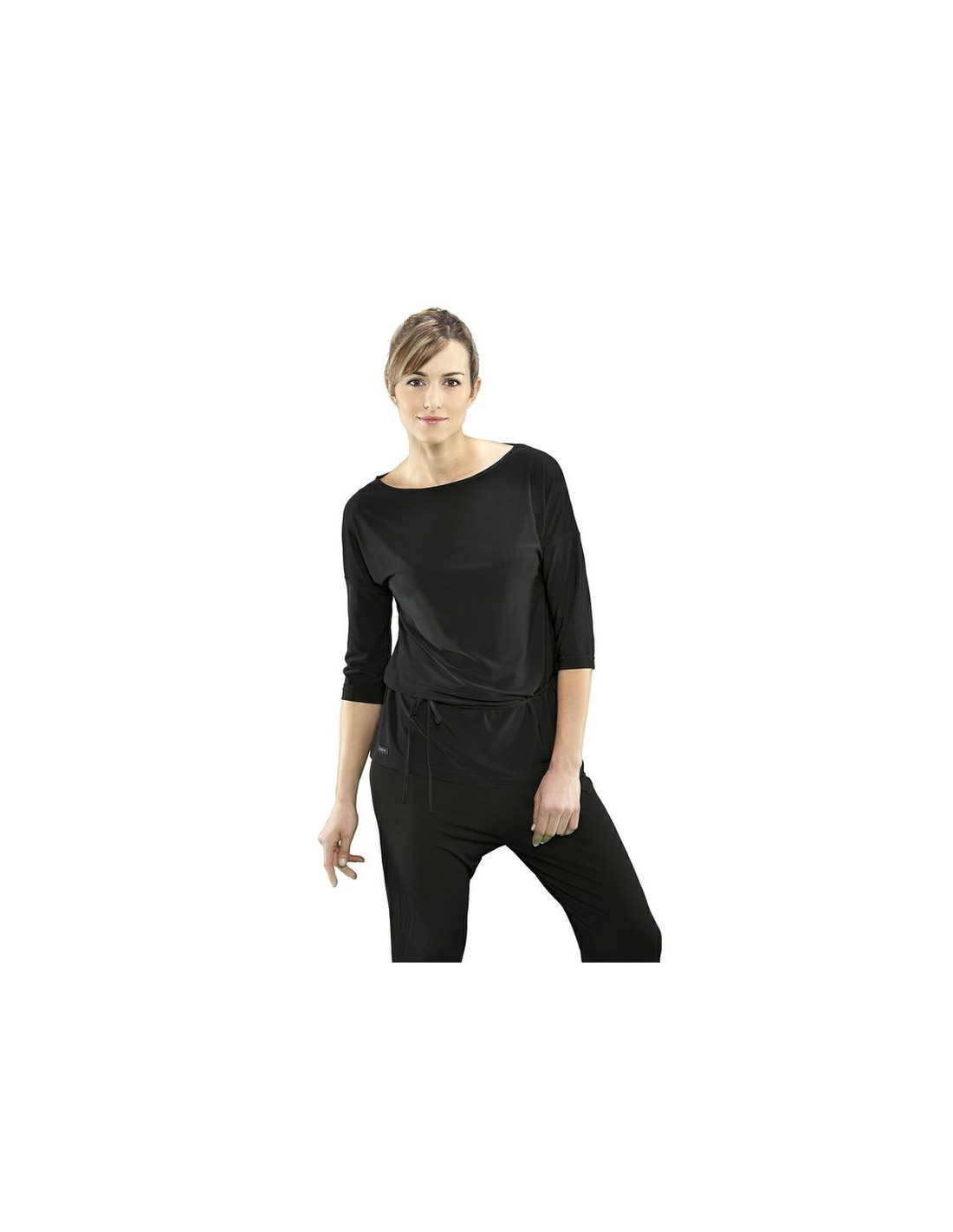 Camiseta larga negra, media manga, cuello redondo, muy cómoda, ajustable con cinta para la cintura.