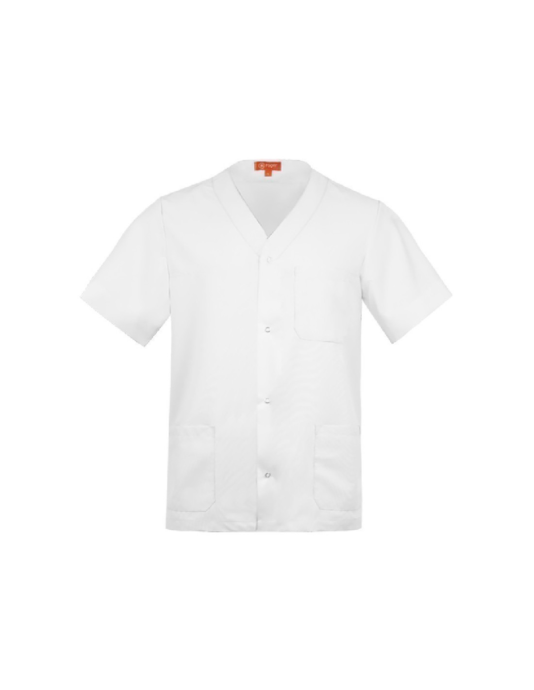 Casaca sanitaria con escote pico y manga corta, abertura central con cierre de botones de presión, y tres bolsillos de parche.
