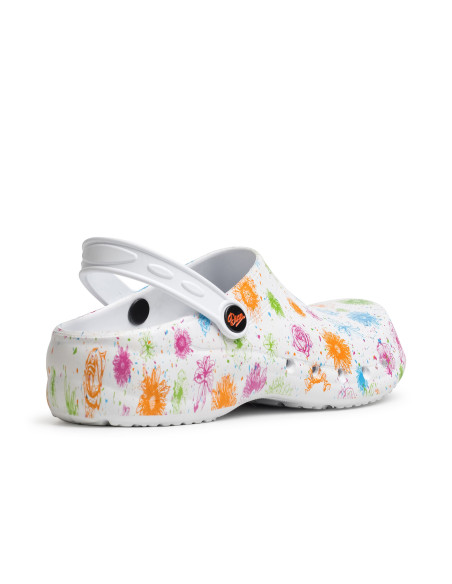 Zueco ultraligero de EVA estampado, antibacteriano, libre de látex, monocasco, anatómico y antideslizante. Apto para lavado en lavadora hasta 40º. Con correa posterior abatible entre el talón y la pala, perforado en los laterales para facilitar la transpiración, la limpieza y evitar la penetración directa dentro del zueco de líquidos o fluidos. Planta con micropuntos de masaje para estimular la circulación sanguínea. Incorpora una plantilla interior de tejido sobre espuma de latex con tratamiento antibacterias. ULTRALIGERO, solo 180 gramos el par.