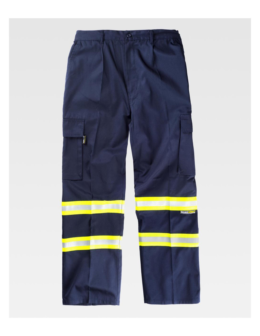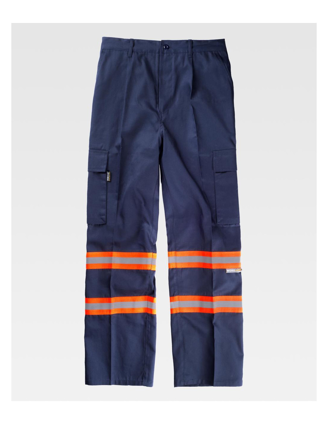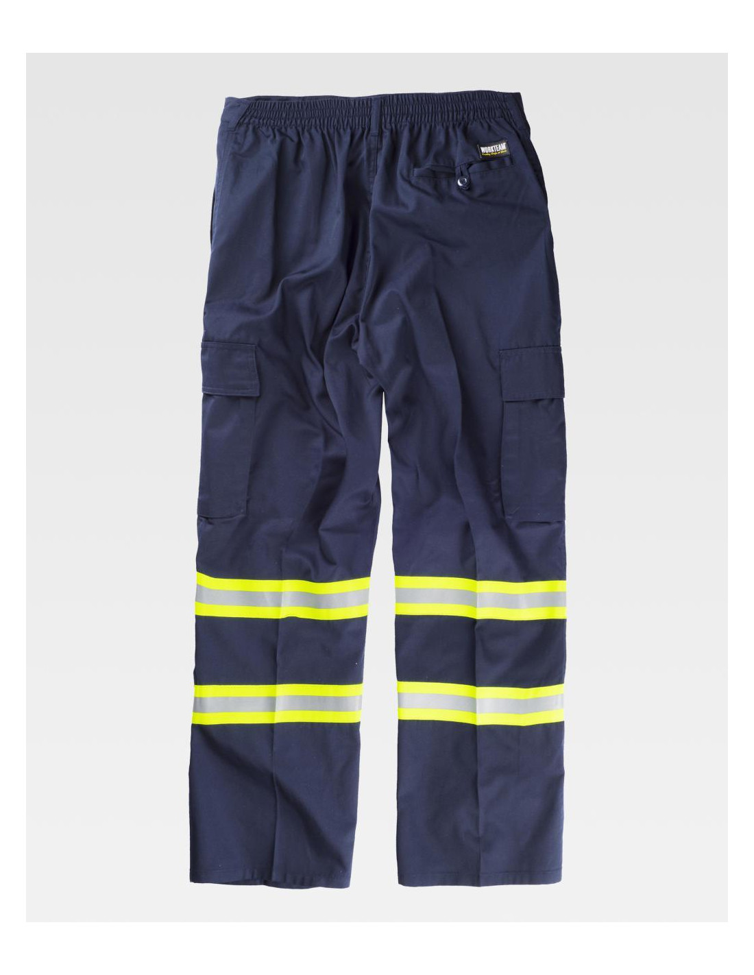 Pantalón recto con cintas reflectante-fluorescentes para mayor visibilidad y seguridad. Equipado con dos bolsillos de abertura inclinada en los costados, dos bolsillos laterales de carga con cartera de velcro, y un bolsillo trasero de ojal con cierre de presilla y botón. Las bandas fluorescentes con cinta reflectante en las perneras aseguran alta visibilidad. Incluye elástico en la cintura, trabillas, y un cierre de botón con bragueta de cremallera para un ajuste cómodo y seguro.