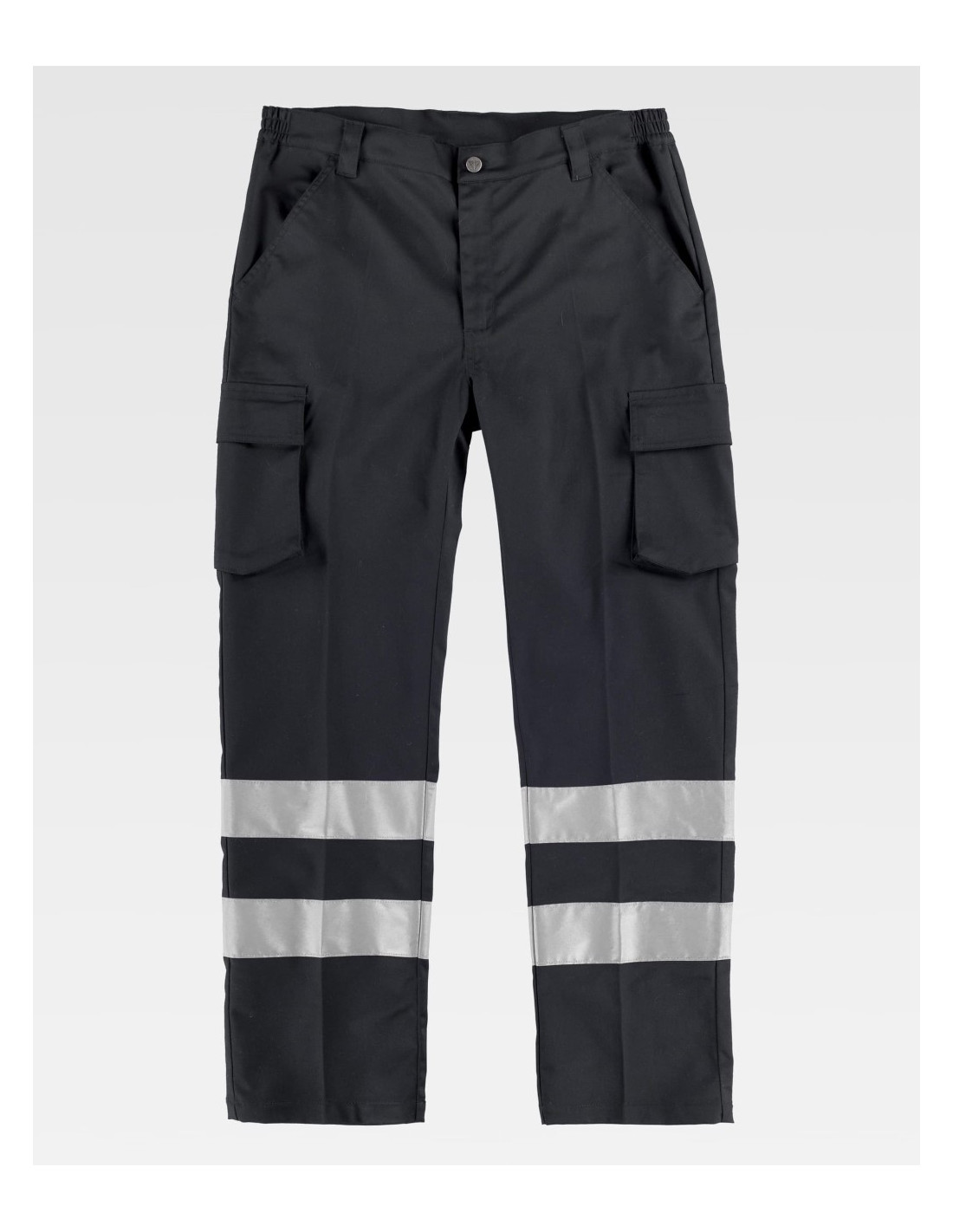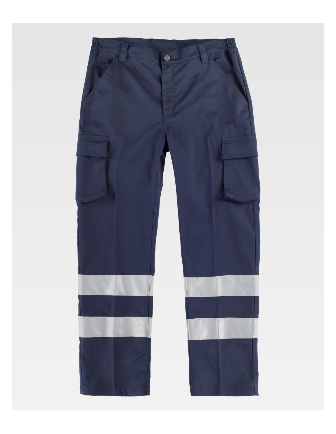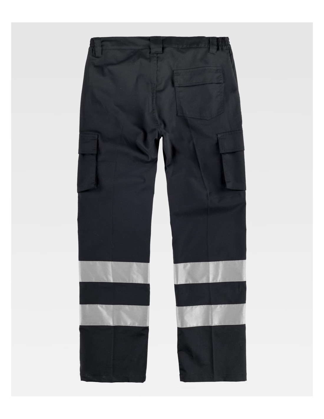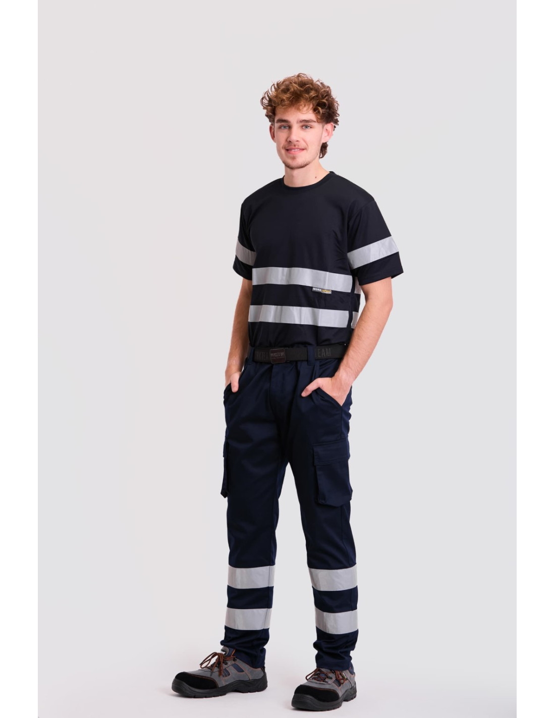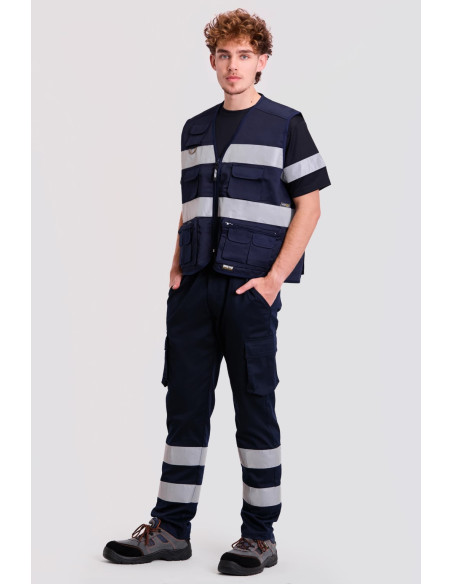 Pantalón de visibilidad realzada con cintas reflectantes y diseño Slim Fit. Equipado con dos bolsillos de abertura inclinada en los costados, dos bolsillos laterales de carga con cartera de velcro, y un bolsillo trasero de plastón con cartera de velcro. Las cintas reflectantes en las perneras aseguran alta visibilidad. Incluye elástico en los laterales de la cintura, trabillas, y un cierre de botón con bragueta de cremallera para un ajuste cómodo y seguro.