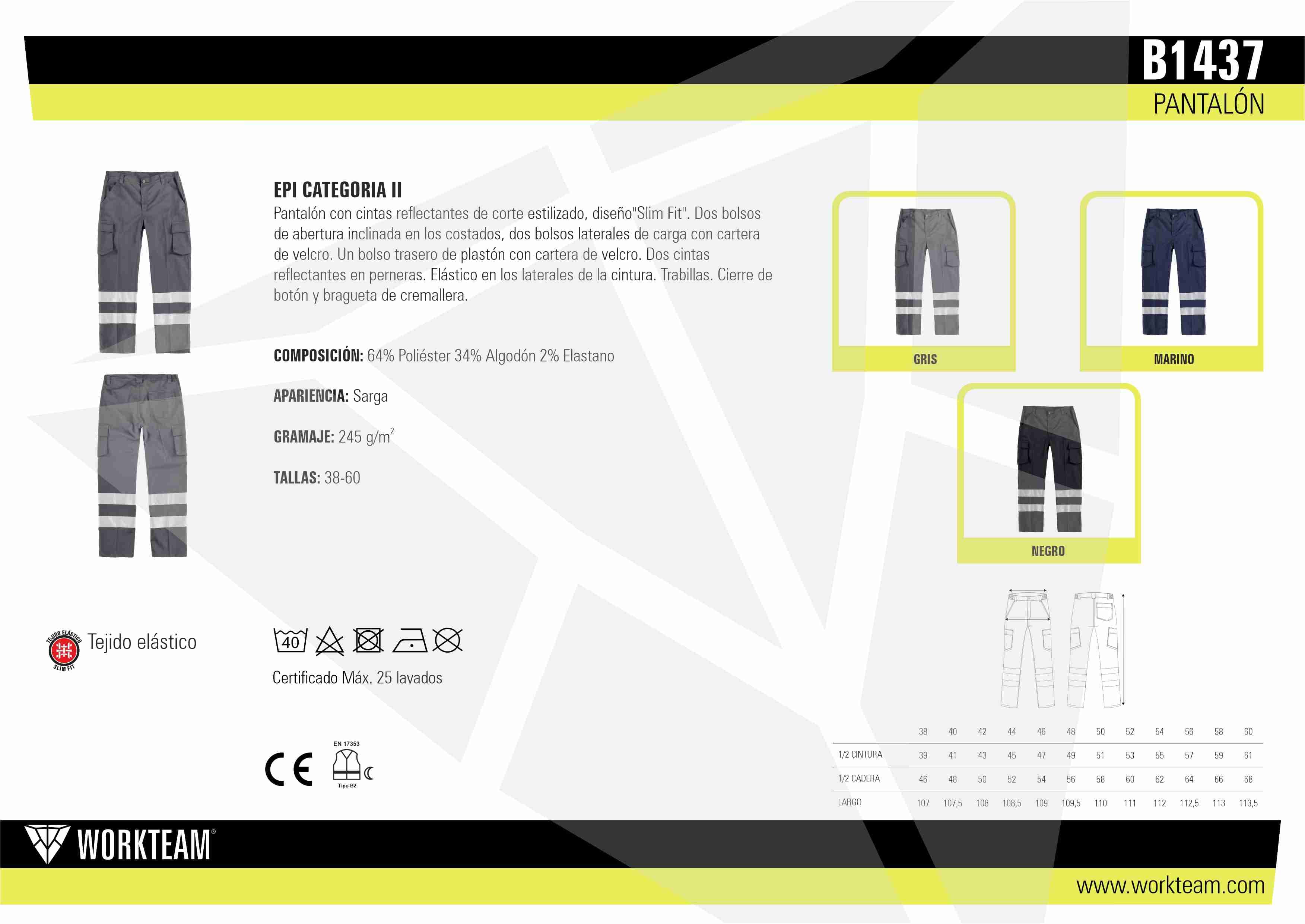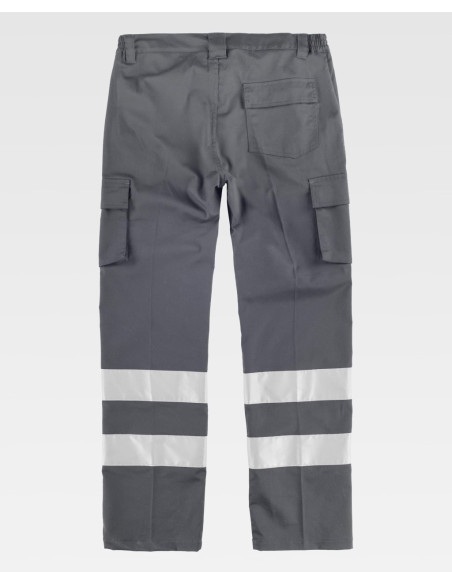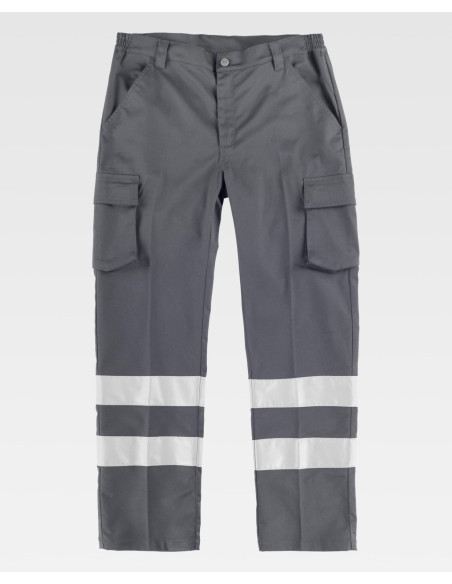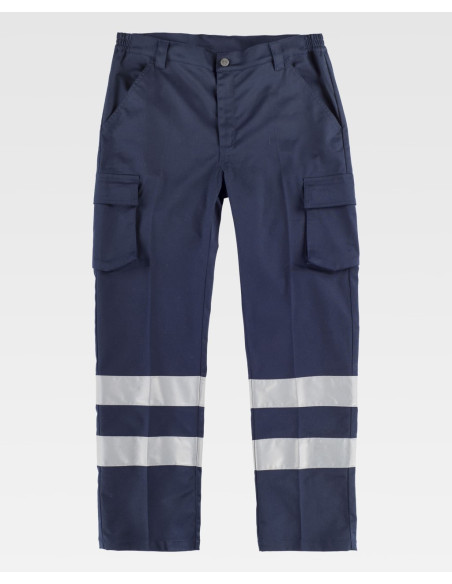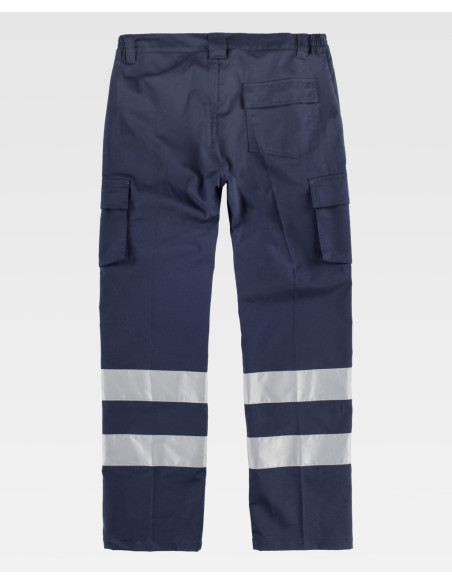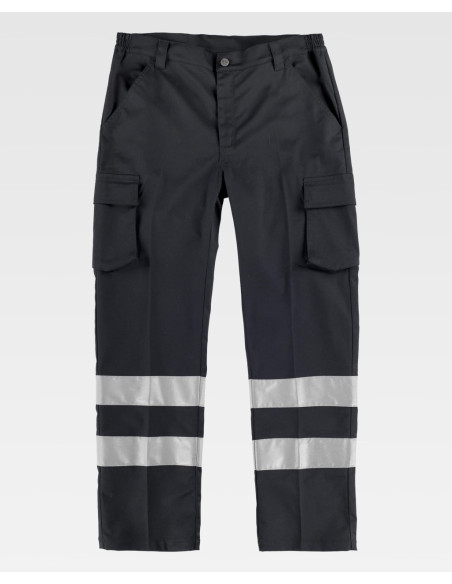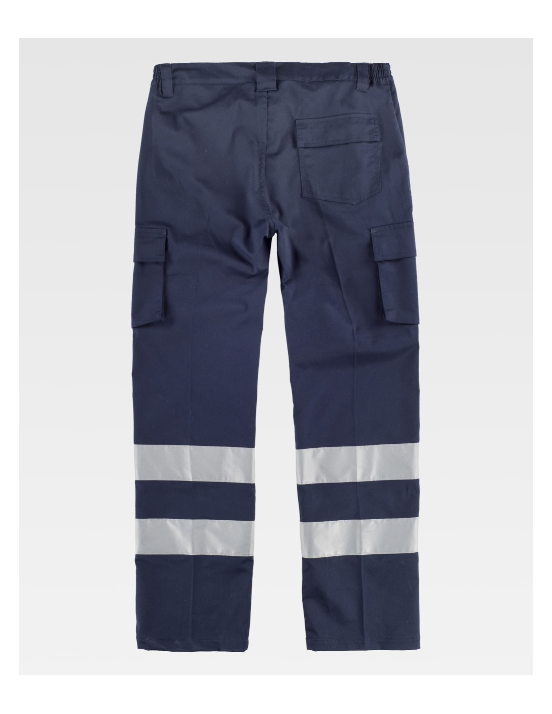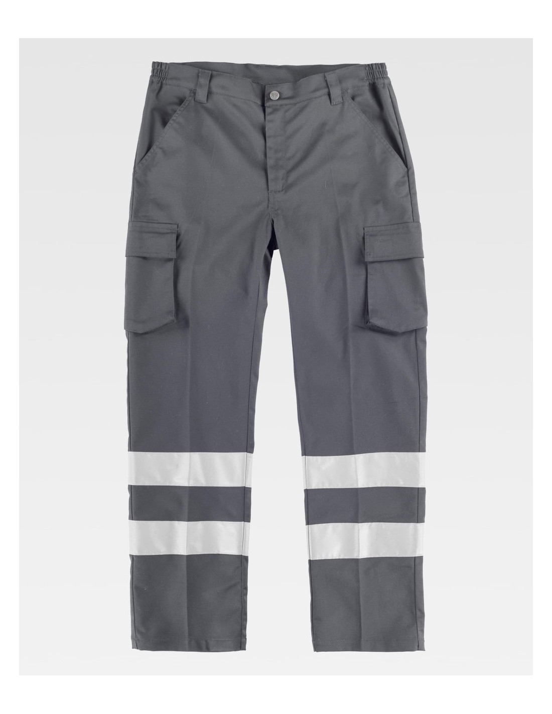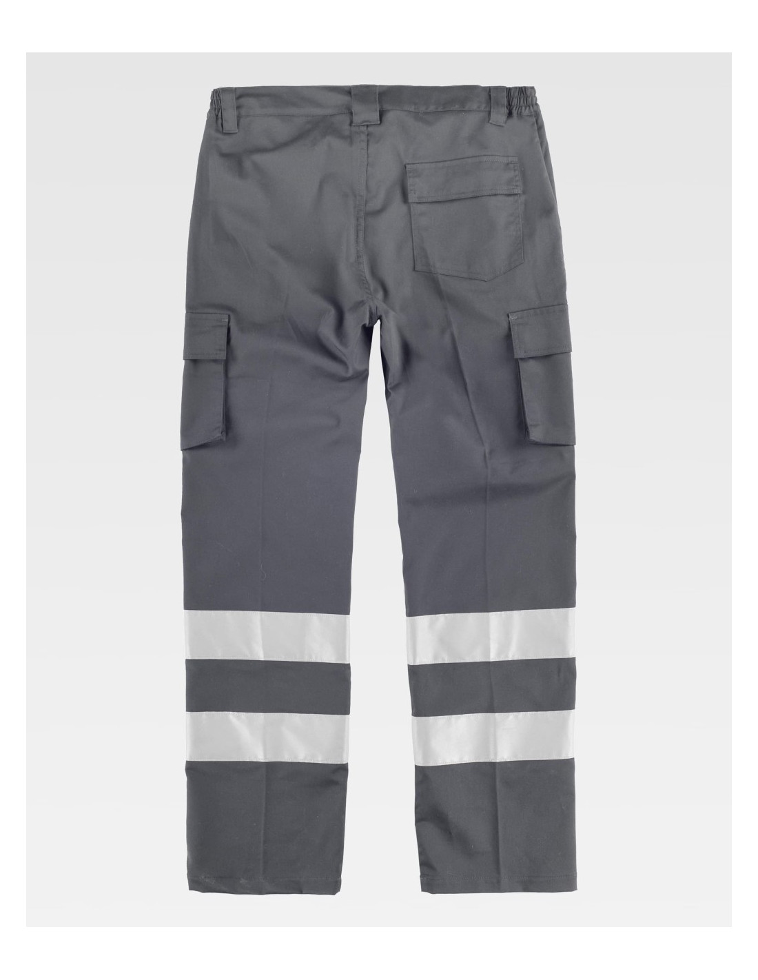 Pantalón de visibilidad realzada con cintas reflectantes y diseño Slim Fit. Equipado con dos bolsillos de abertura inclinada en los costados, dos bolsillos laterales de carga con cartera de velcro, y un bolsillo trasero de plastón con cartera de velcro. Las cintas reflectantes en las perneras aseguran alta visibilidad. Incluye elástico en los laterales de la cintura, trabillas, y un cierre de botón con bragueta de cremallera para un ajuste cómodo y seguro.