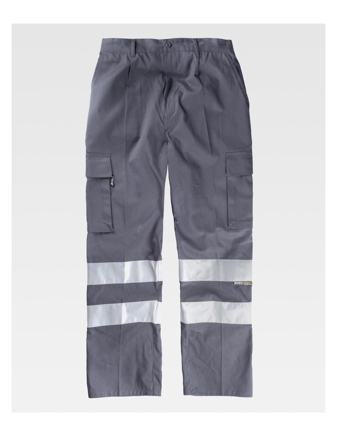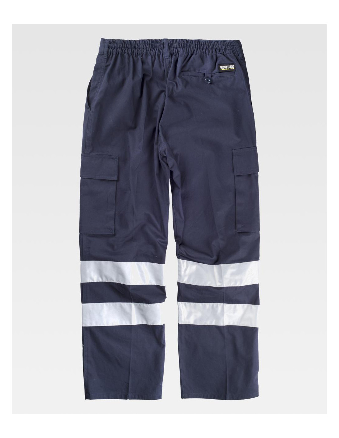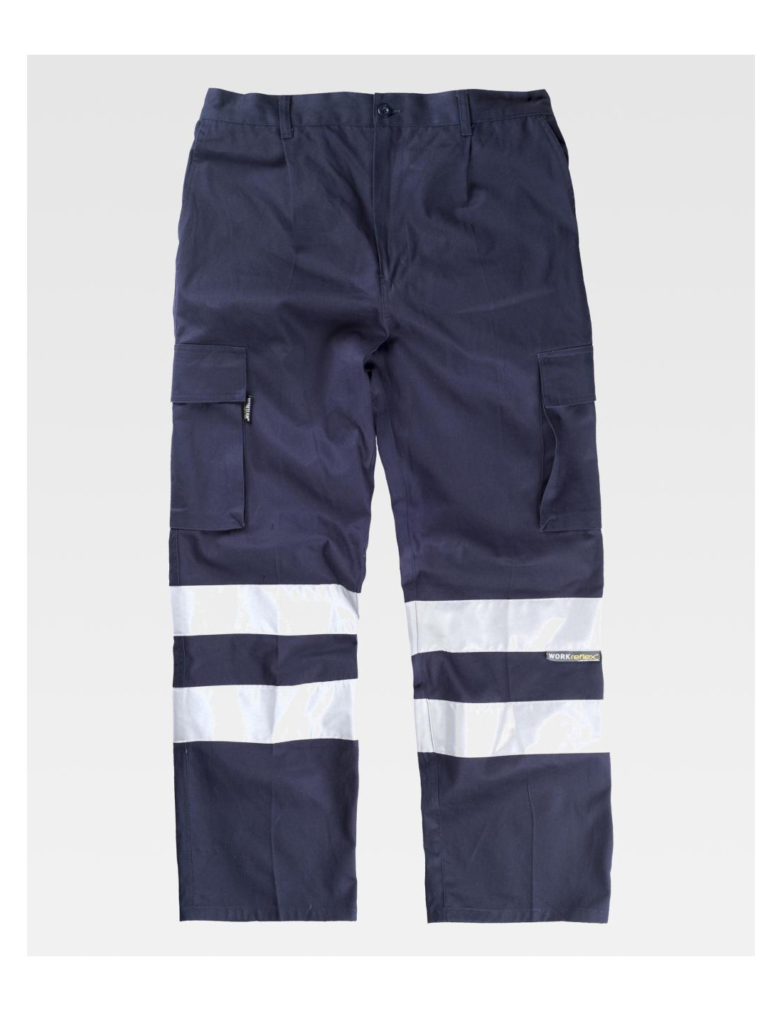 Pantalón recto de algodón con cintas reflectantes. Equipado con dos bolsillos de abertura inclinada en los costados, dos bolsillos laterales de carga con cartera de velcro, y un bolsillo trasero de ojal con cierre de presilla y botón. Las cintas reflectantes en las perneras aseguran alta visibilidad. Incluye elástico en la cintura, trabillas, y un cierre de botón con bragueta de cremallera para un ajuste cómodo y seguro.