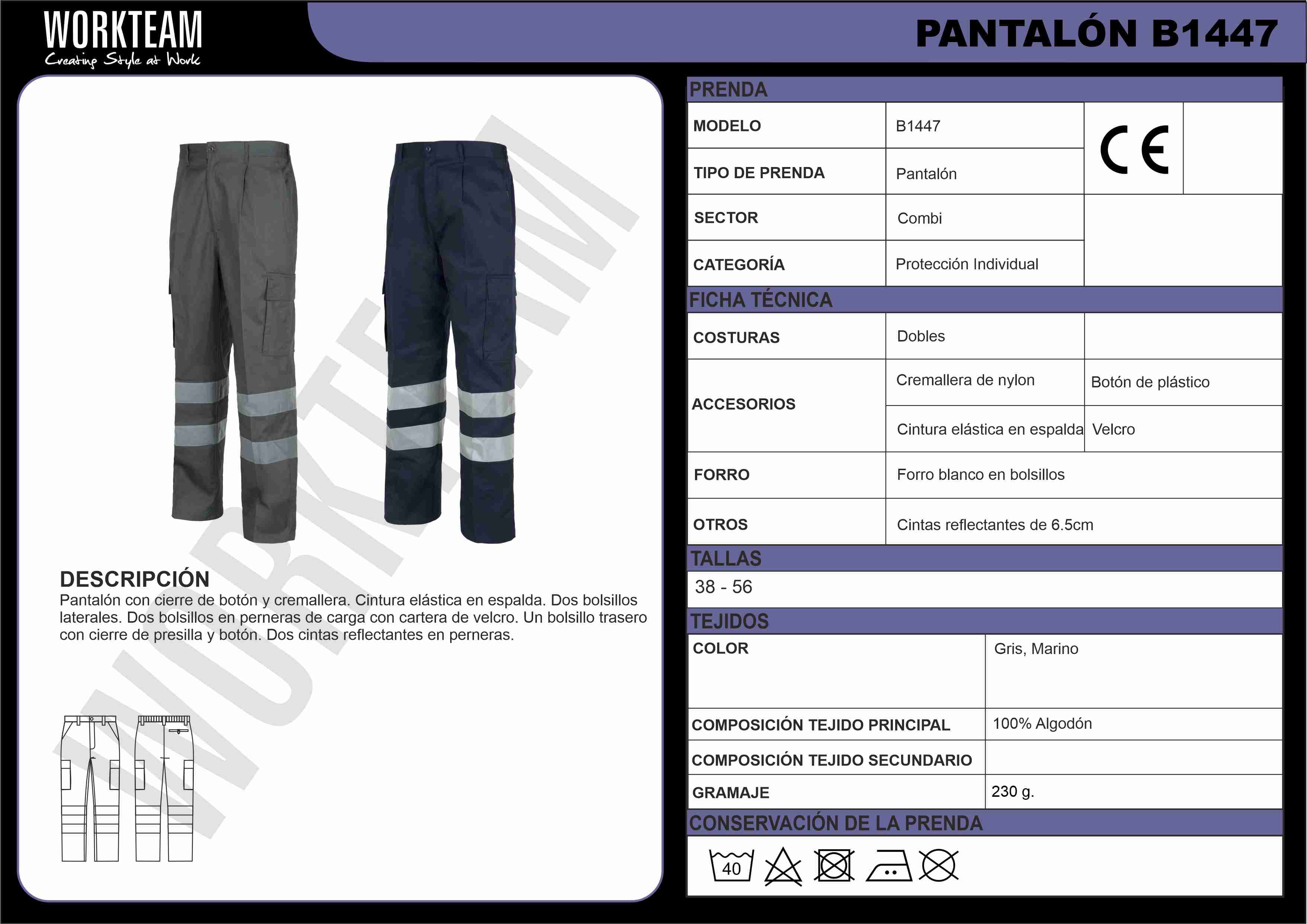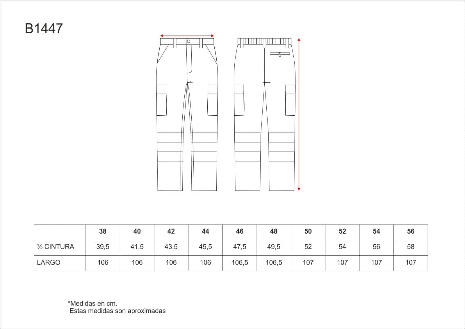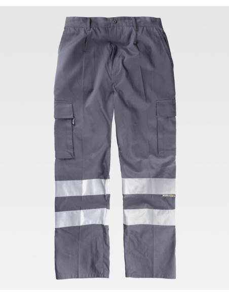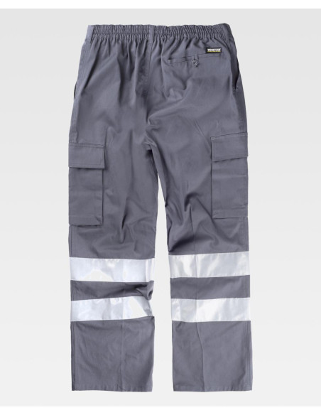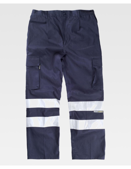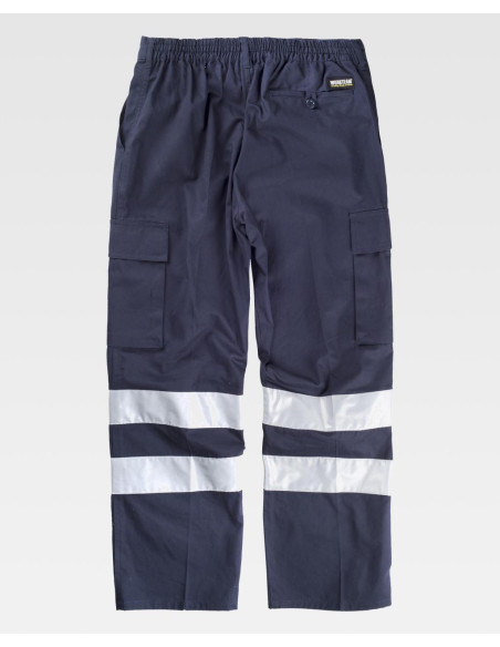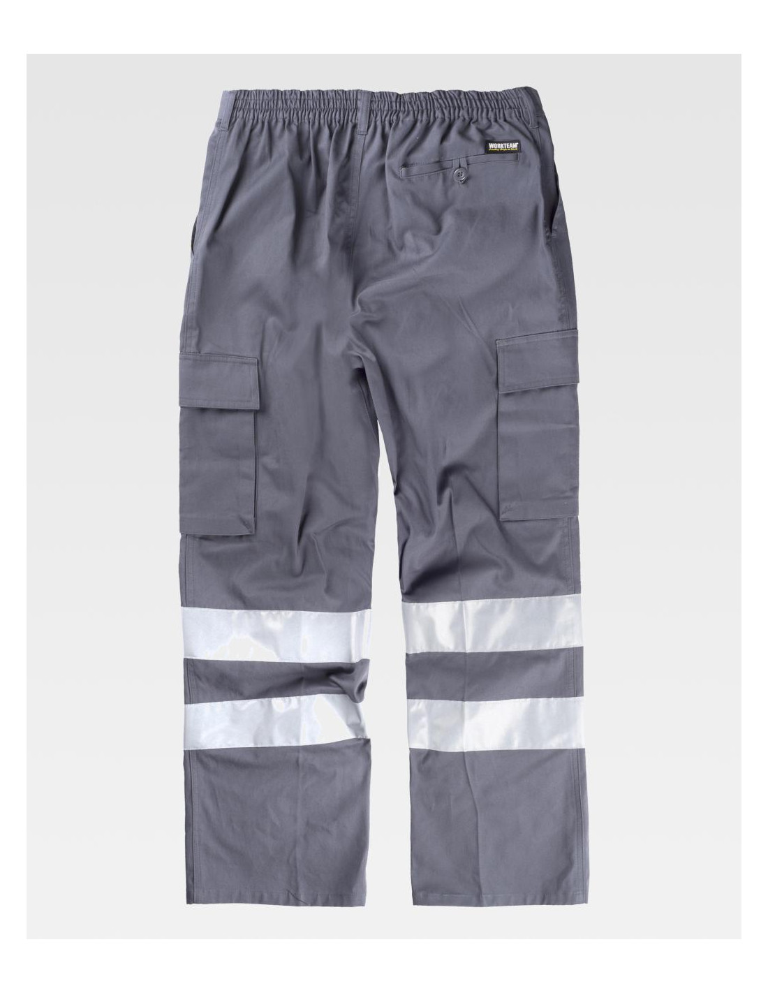 Pantalón recto de algodón con cintas reflectantes. Equipado con dos bolsillos de abertura inclinada en los costados, dos bolsillos laterales de carga con cartera de velcro, y un bolsillo trasero de ojal con cierre de presilla y botón. Las cintas reflectantes en las perneras aseguran alta visibilidad. Incluye elástico en la cintura, trabillas, y un cierre de botón con bragueta de cremallera para un ajuste cómodo y seguro.