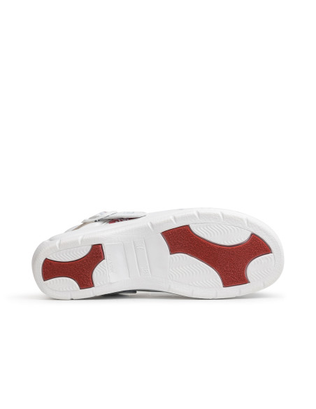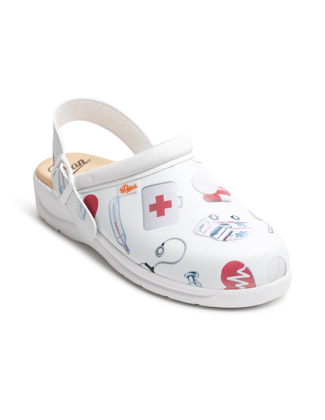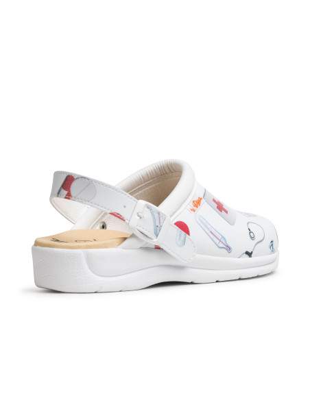 Zueco estampado con correa abatible de sujeción en el talón, fabricado con microfibra transpirable D’COVER OEKO-TEX® con acolchado en el empeine para evitar rozaduras, montado sobre horma recta de puntera redondeada. Plantilla anatómica forrada con barra metatarsal. Suela antibacteriana de poliuretano en forma de cuña, antideslizante de doble densidad, bicomponente de poliuretano y TPU combinados para aumentar el coeficiente antideslizante del zueco.