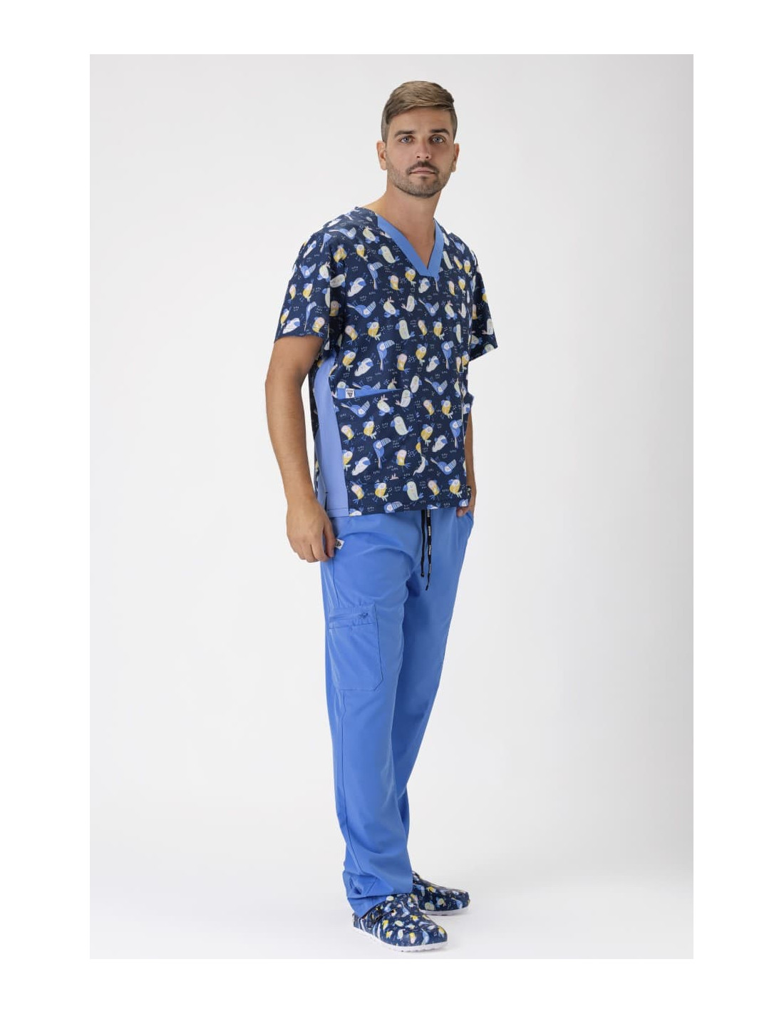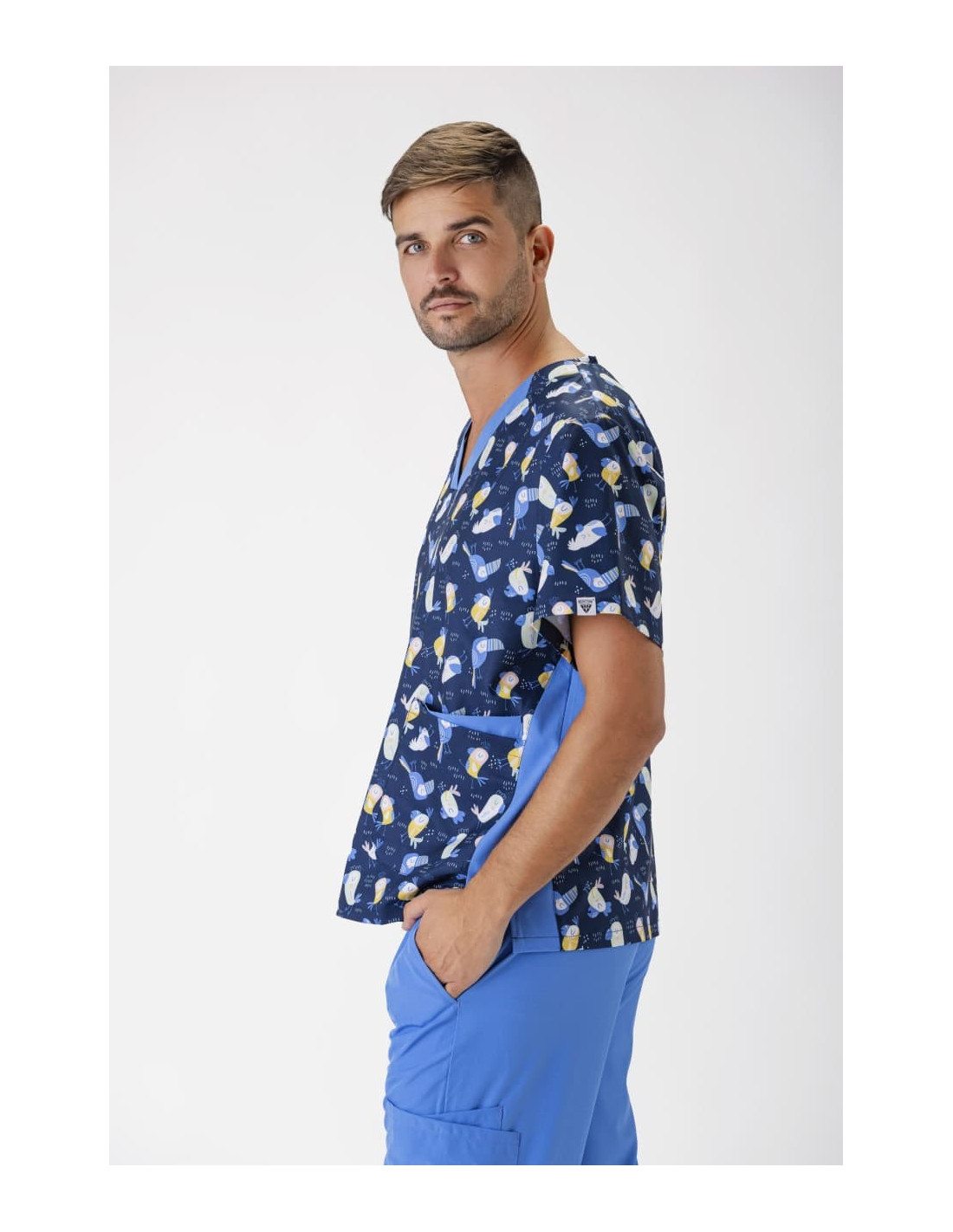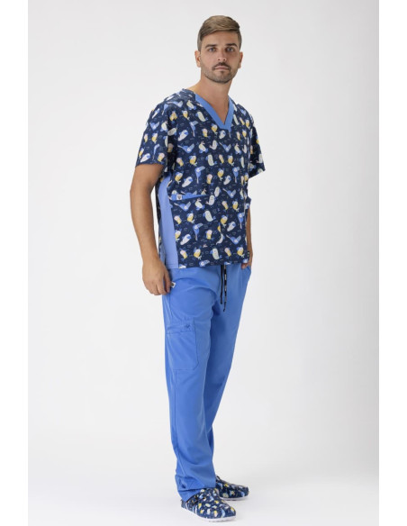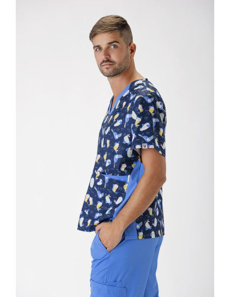 Casaca unisex de manga corta confeccionada con tejido elástico y estampado, ofreciendo un ajuste cómodo y estilizado. Incluye un cuello a pico y canesú en la espalda para mayor movilidad y confort. Dispone de dos bolsillos dobles laterales de plastón, ideales para almacenamiento práctico, y aberturas en los costados que facilitan el movimiento. Esta prenda es perfecta para profesionales que buscan combinar funcionalidad con un diseño moderno.