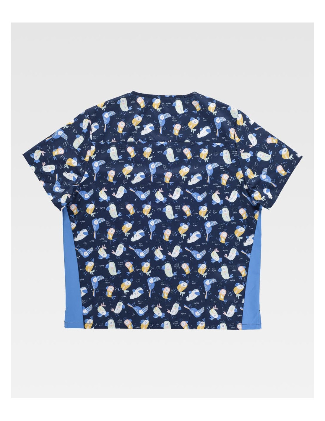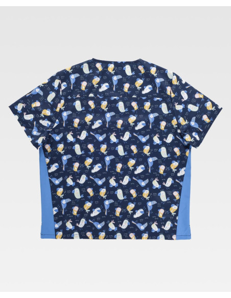 Casaca unisex de manga corta con tejido elástico y estampado. Cuello a pico, canesú en la espalda, dos bolsillos dobles laterales de plastón y aberturas en los costados.