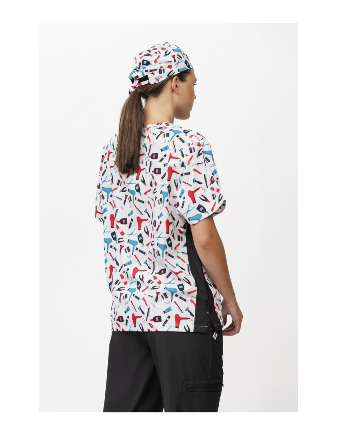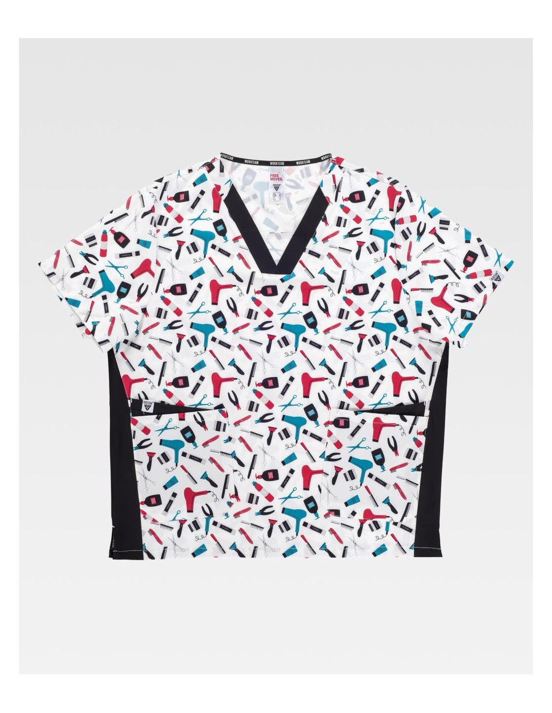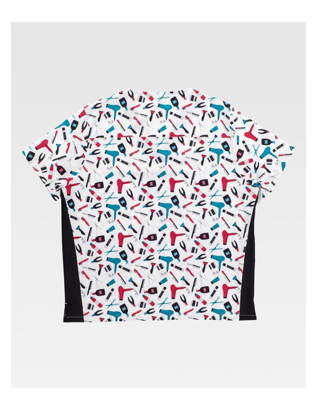 Casaca unisex de manga corta con tejido elástico y estampado, cuello a pico, canesú en la espalda, dos bolsillos dobles laterales de plastón y aberturas en los costados.