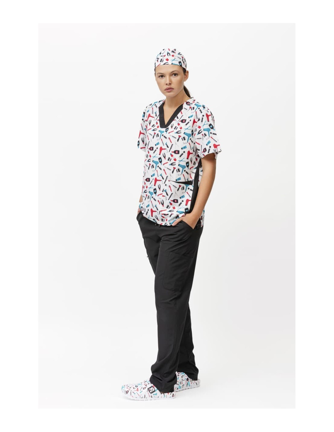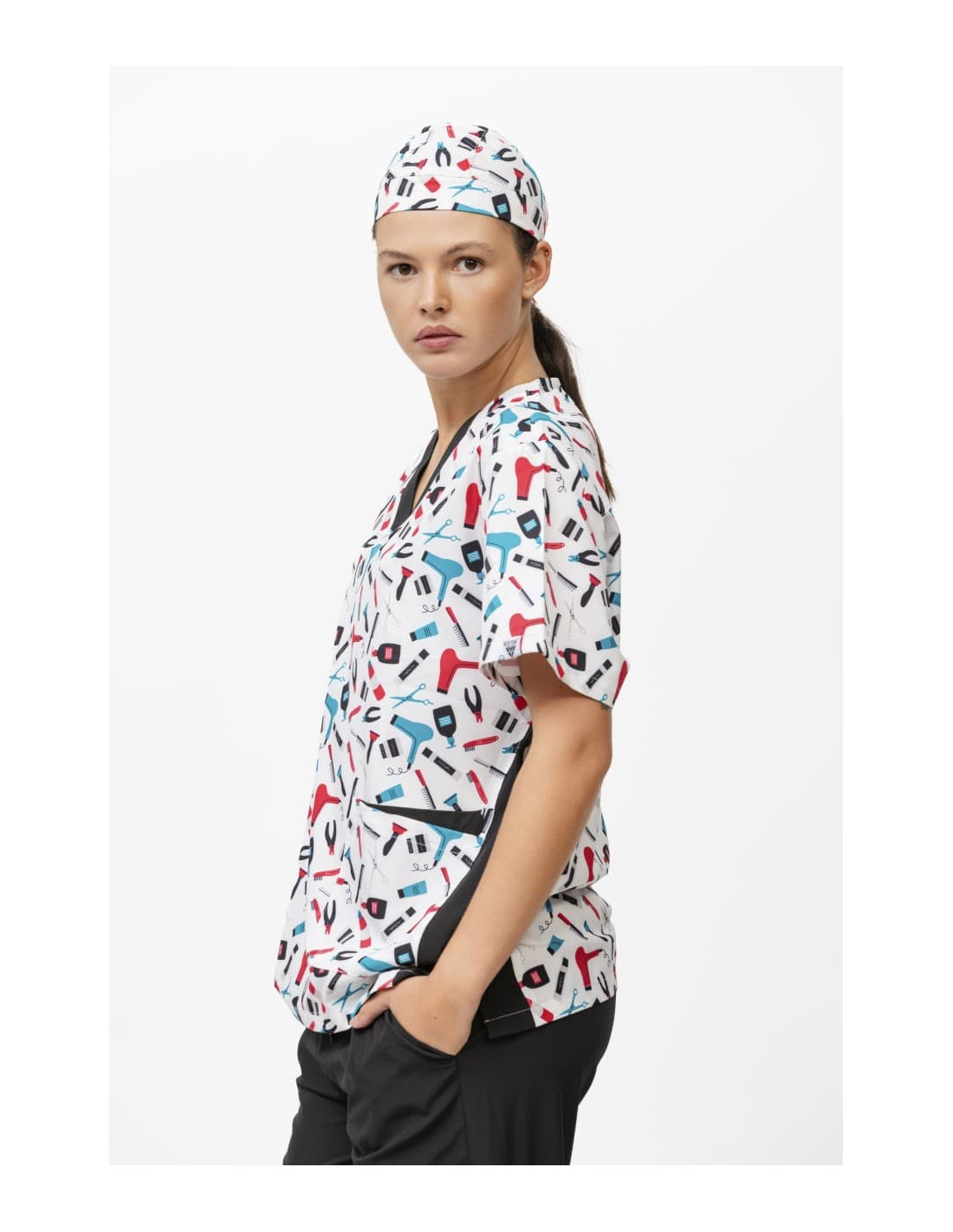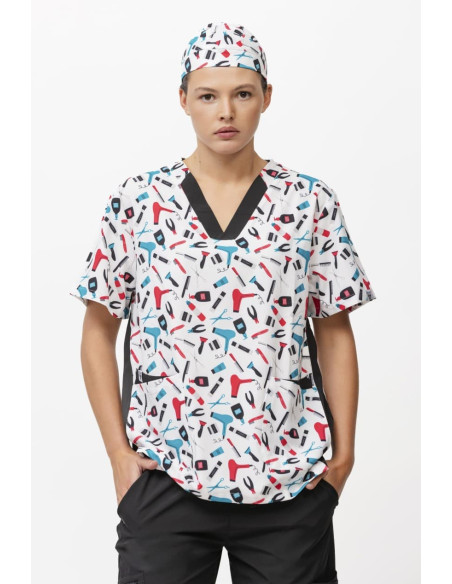 Casaca unisex de manga corta con tejido elástico y estampado, cuello a pico, canesú en la espalda, dos bolsillos dobles laterales de plastón y aberturas en los costados.