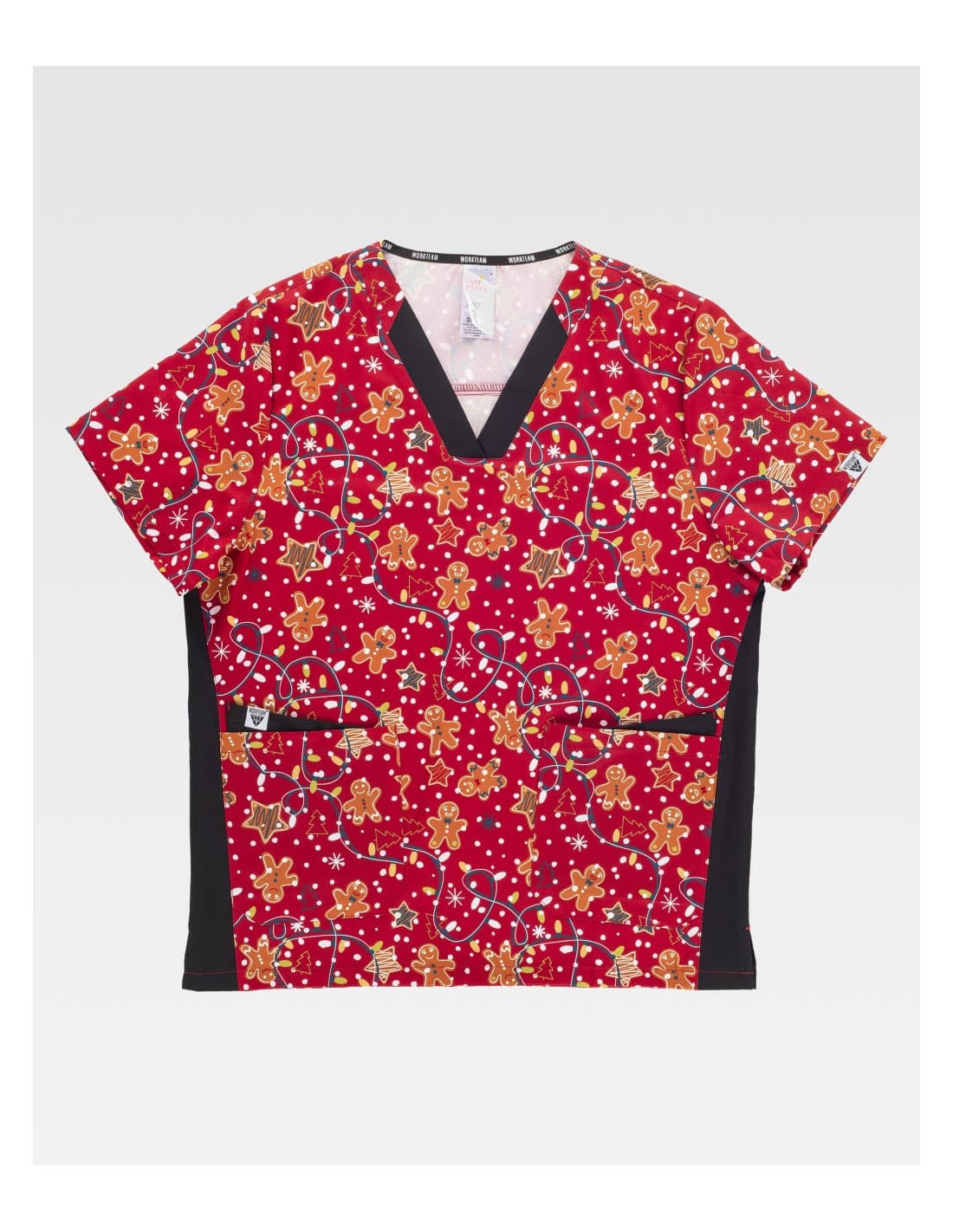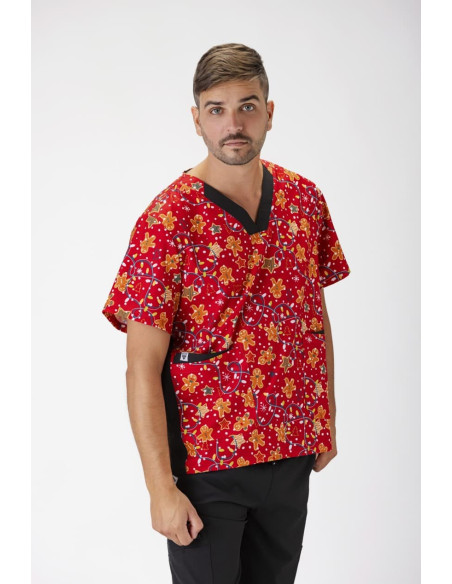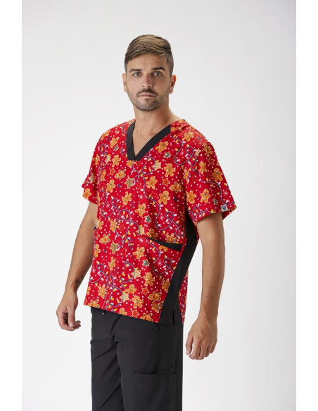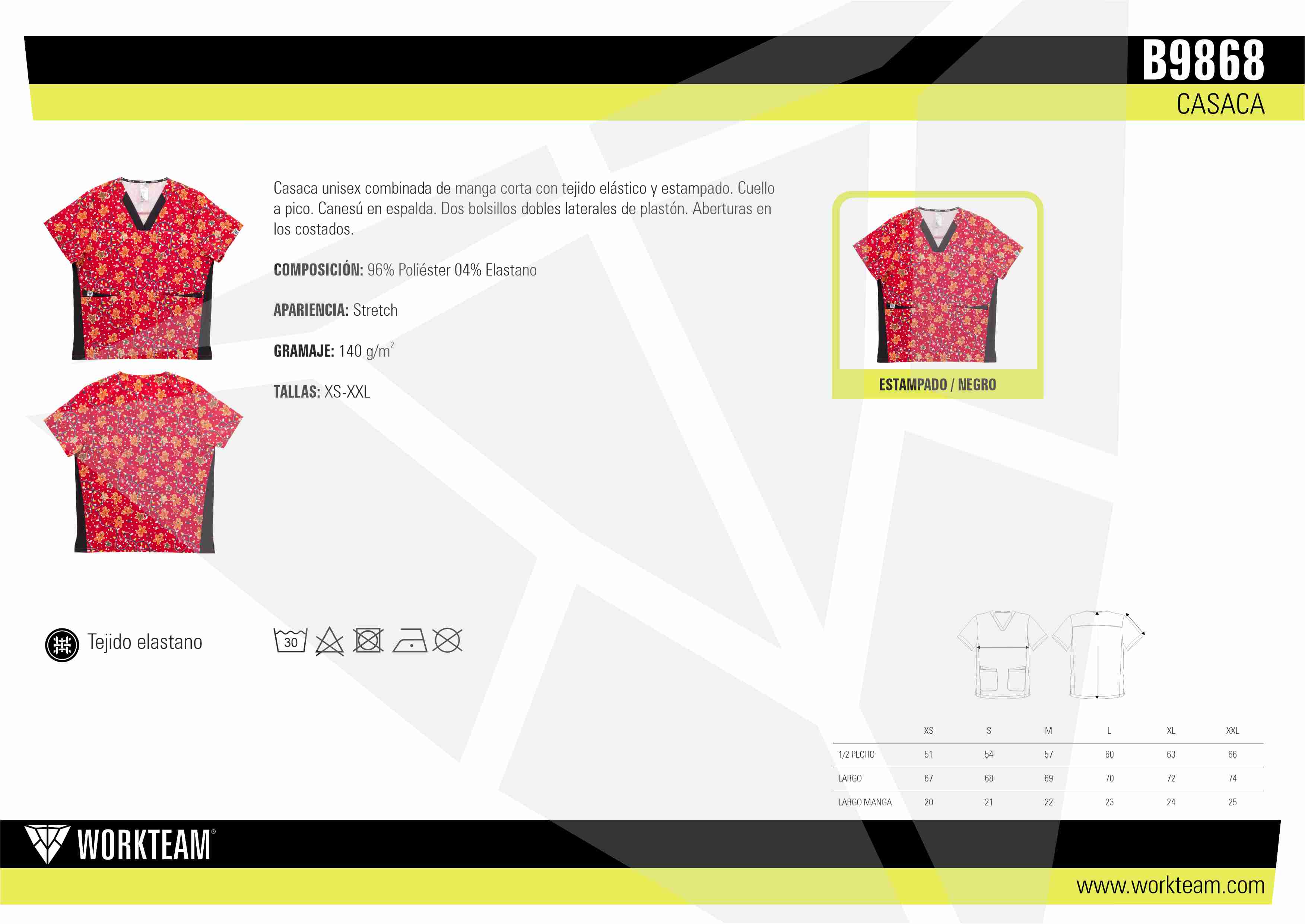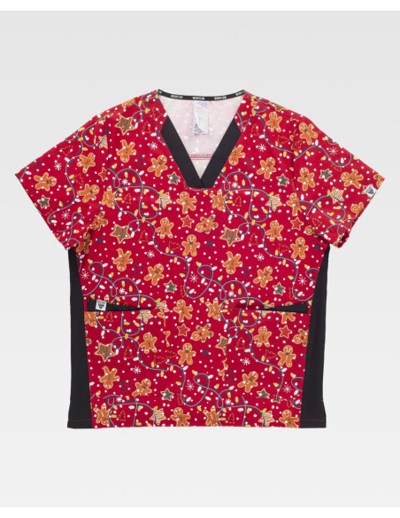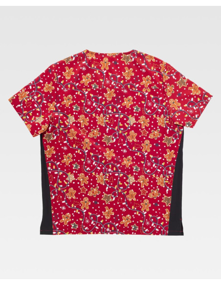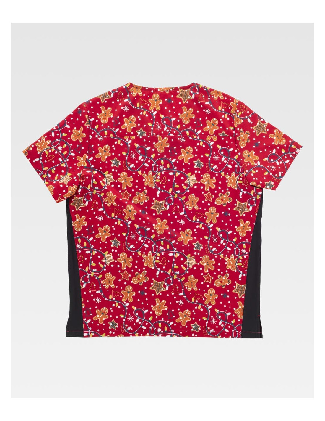 Casaca unisex de manga corta con tejido elástico y estampado, cuello a pico, canesú en la espalda, dos bolsillos dobles laterales de plastón y aberturas en los costados.