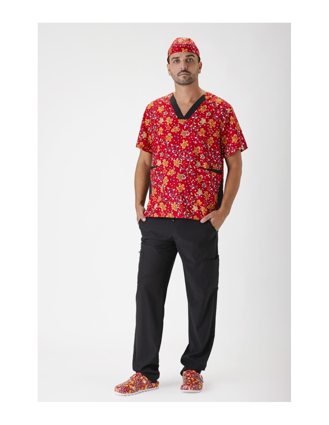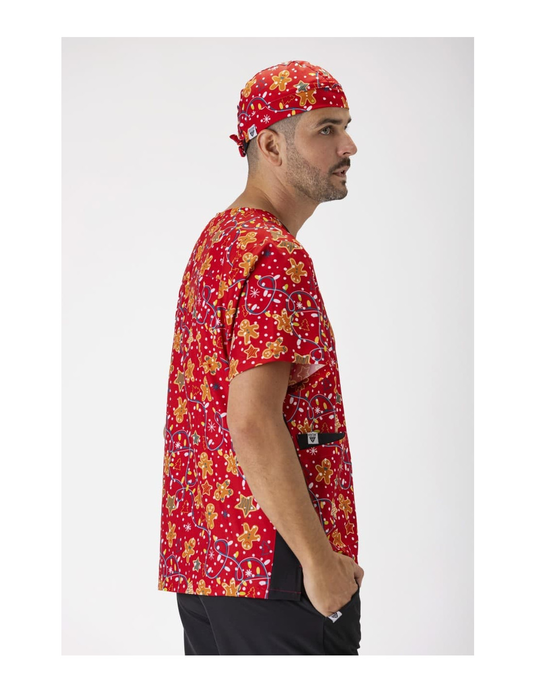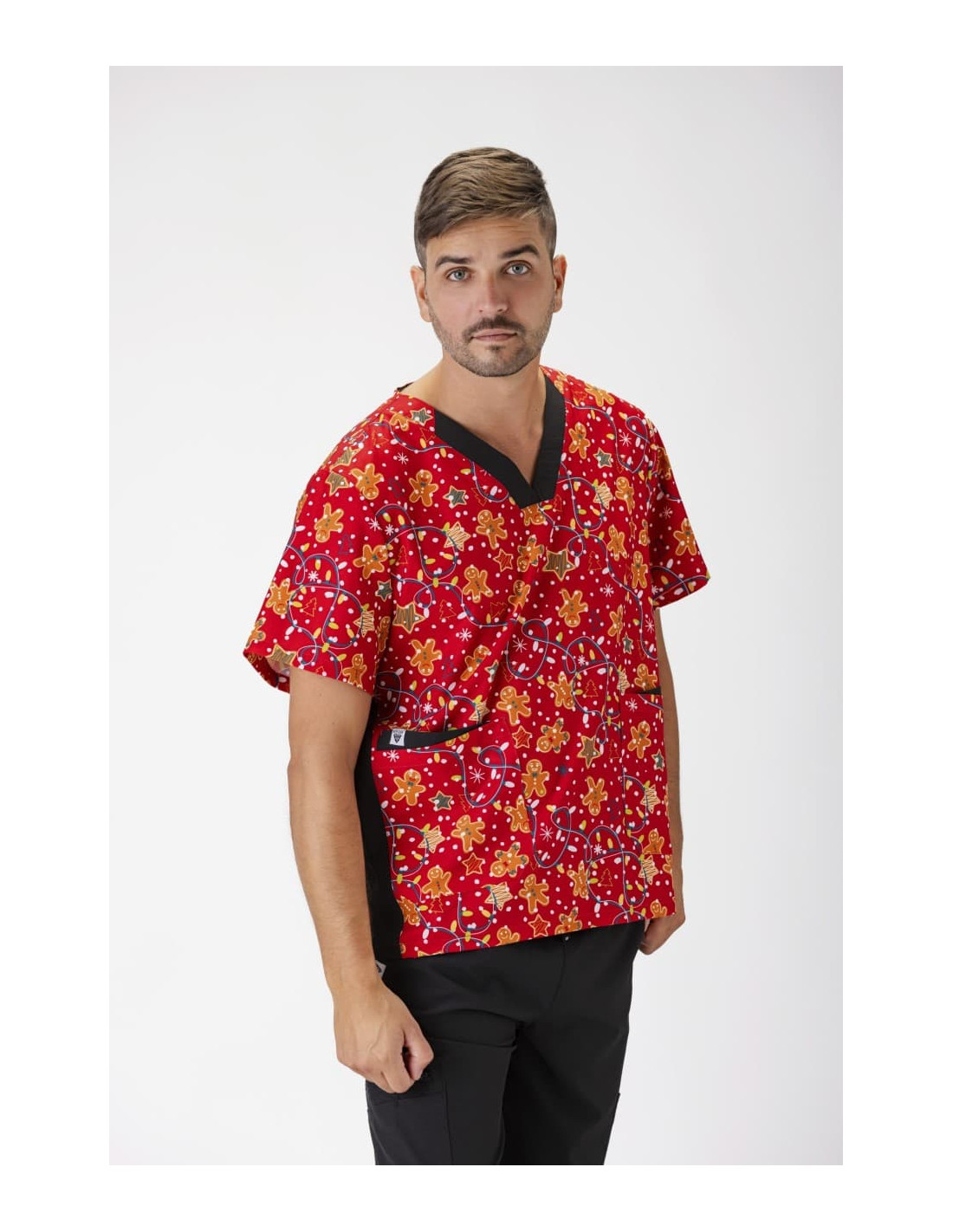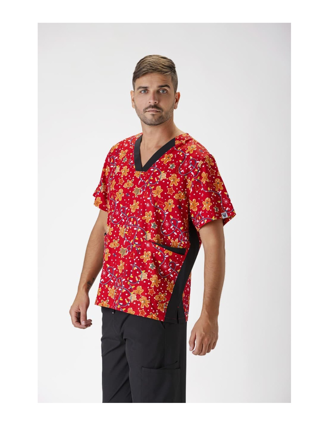 Casaca unisex de manga corta con tejido elástico y estampado, cuello a pico, canesú en la espalda, dos bolsillos dobles laterales de plastón y aberturas en los costados.