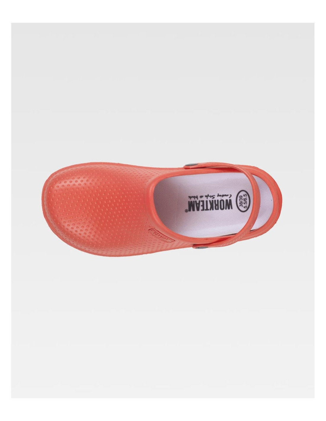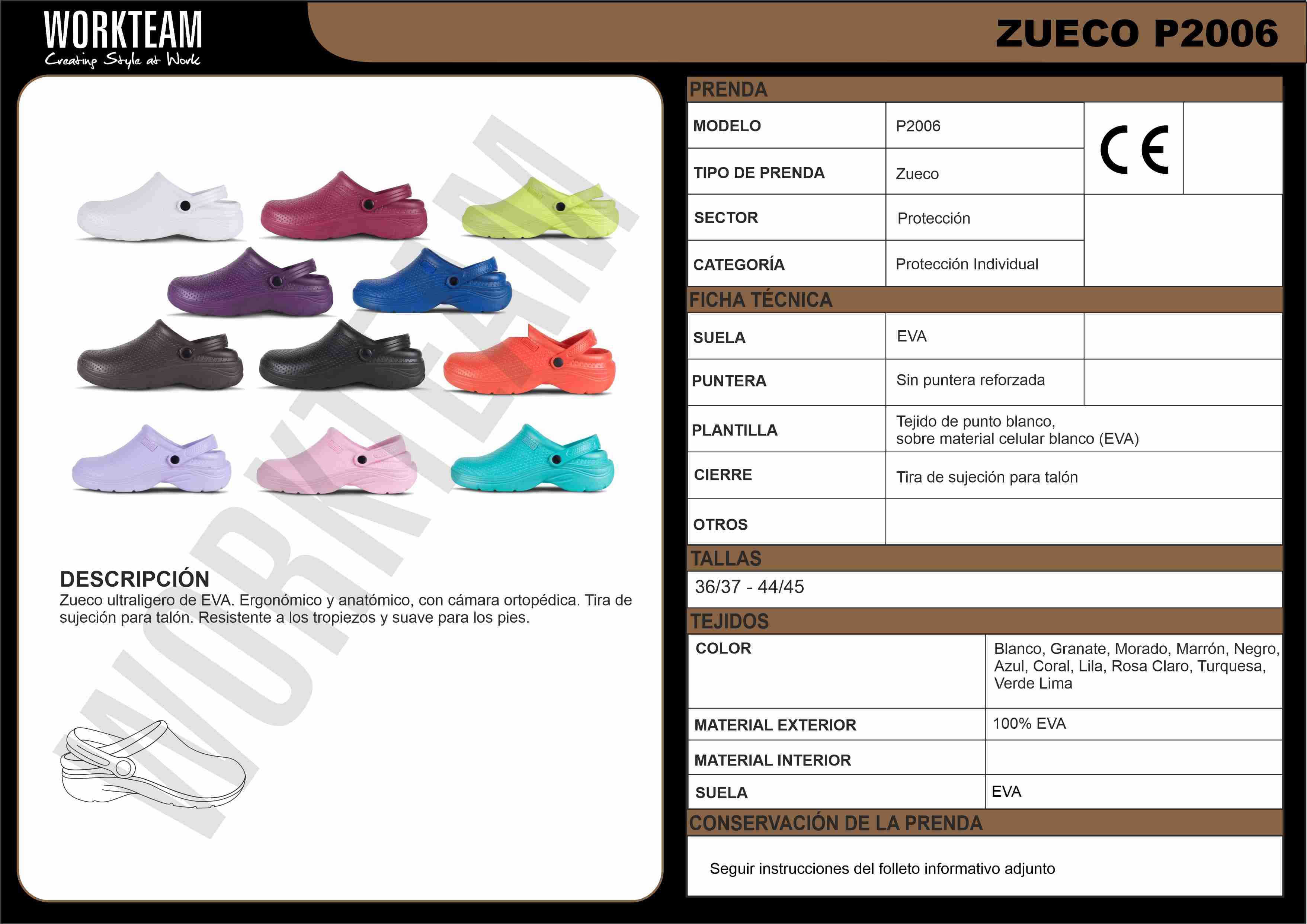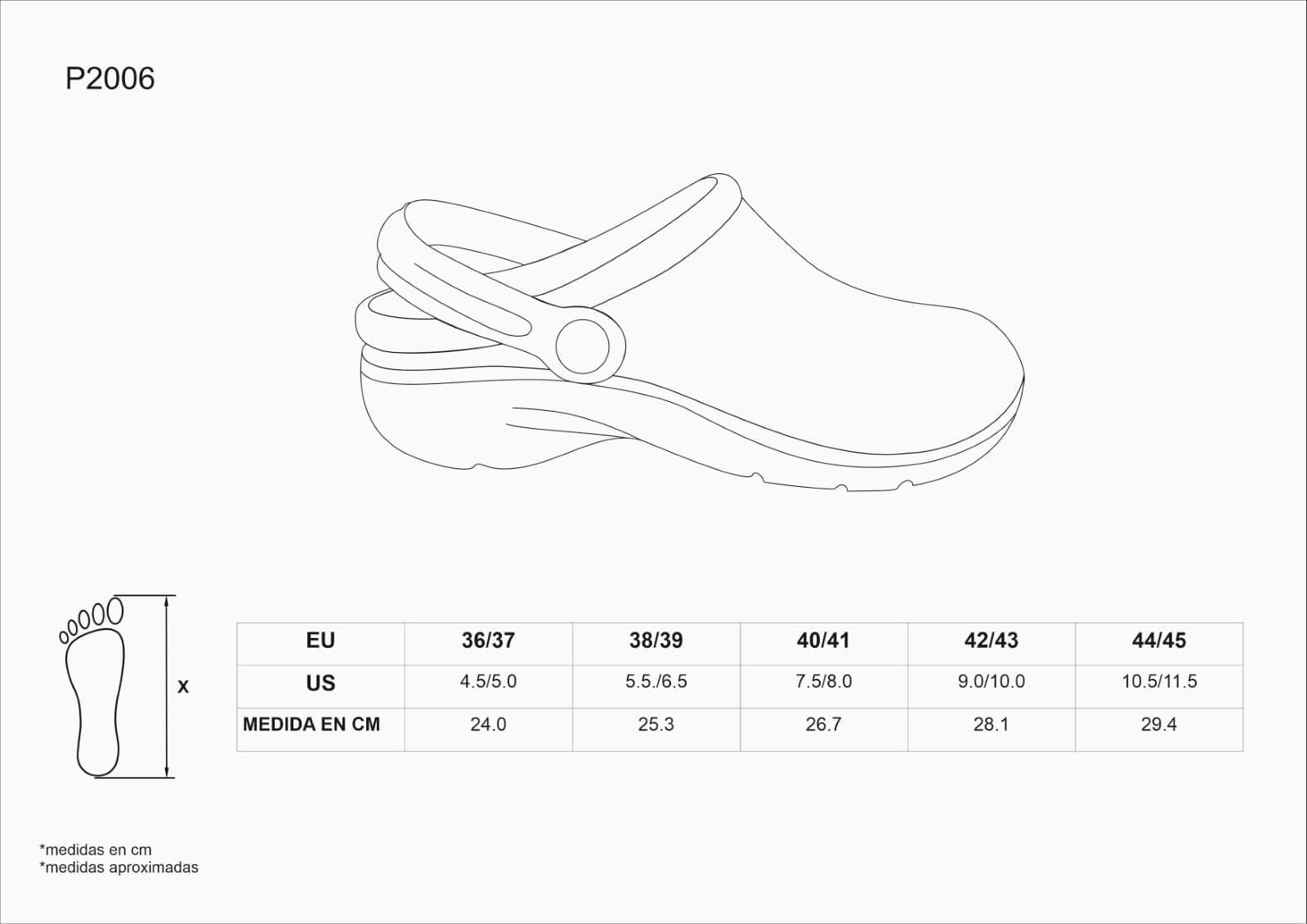 Zueco ultraligero de EVA, ergonómico y anatómico, con cámara ortopédica y tira de sujección para el talón. Resistente a los tropiezos y suave para los pies.