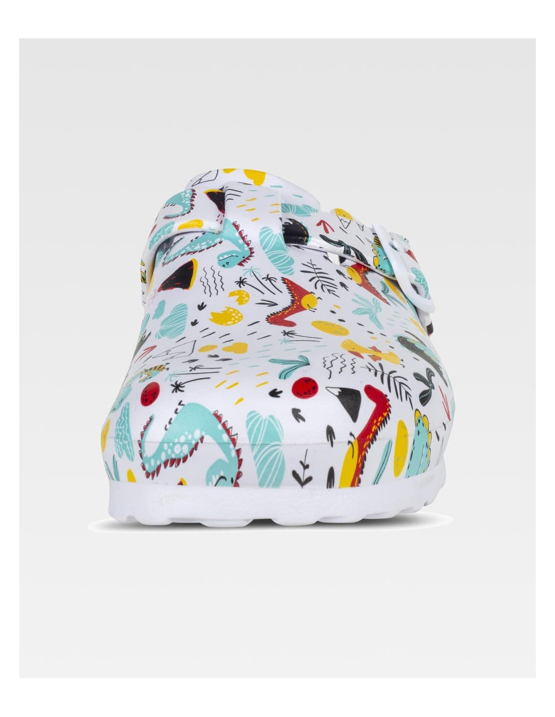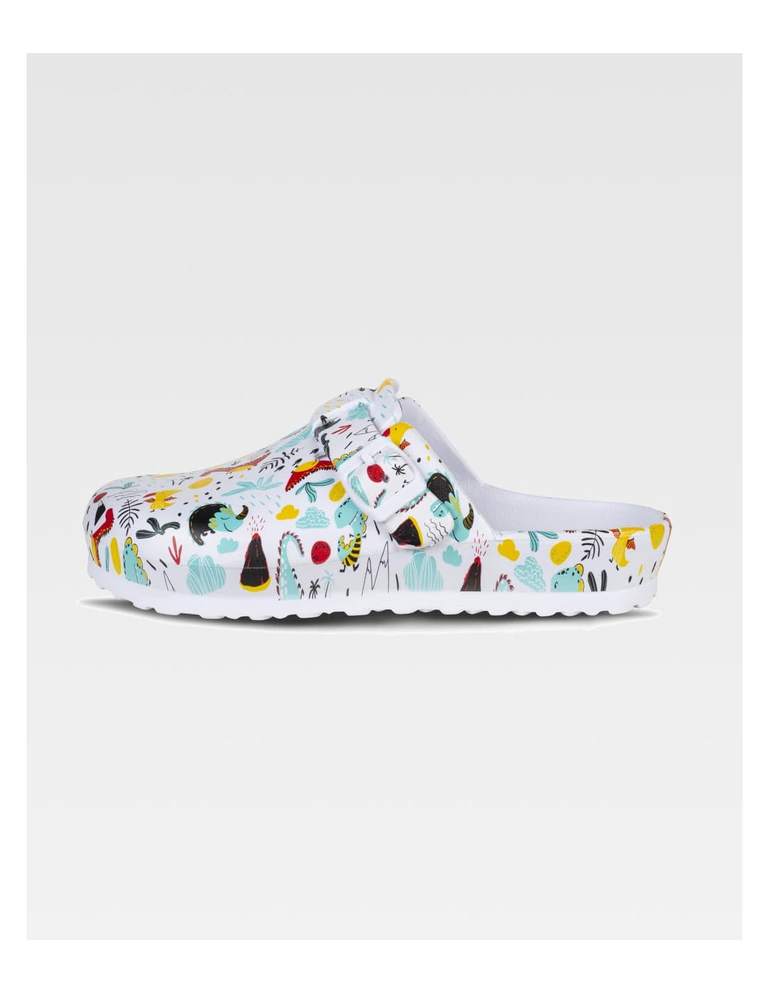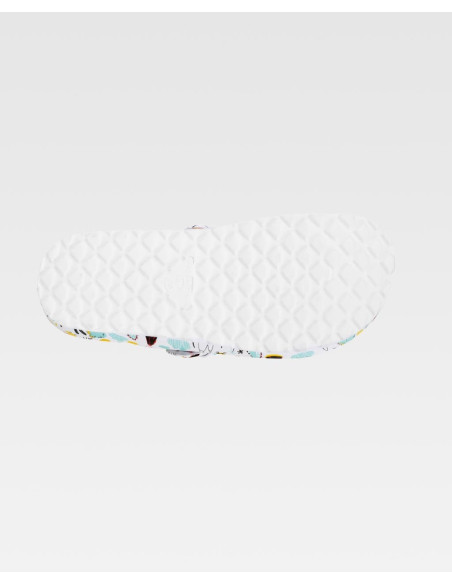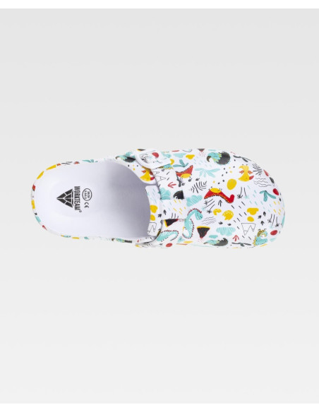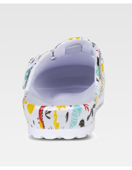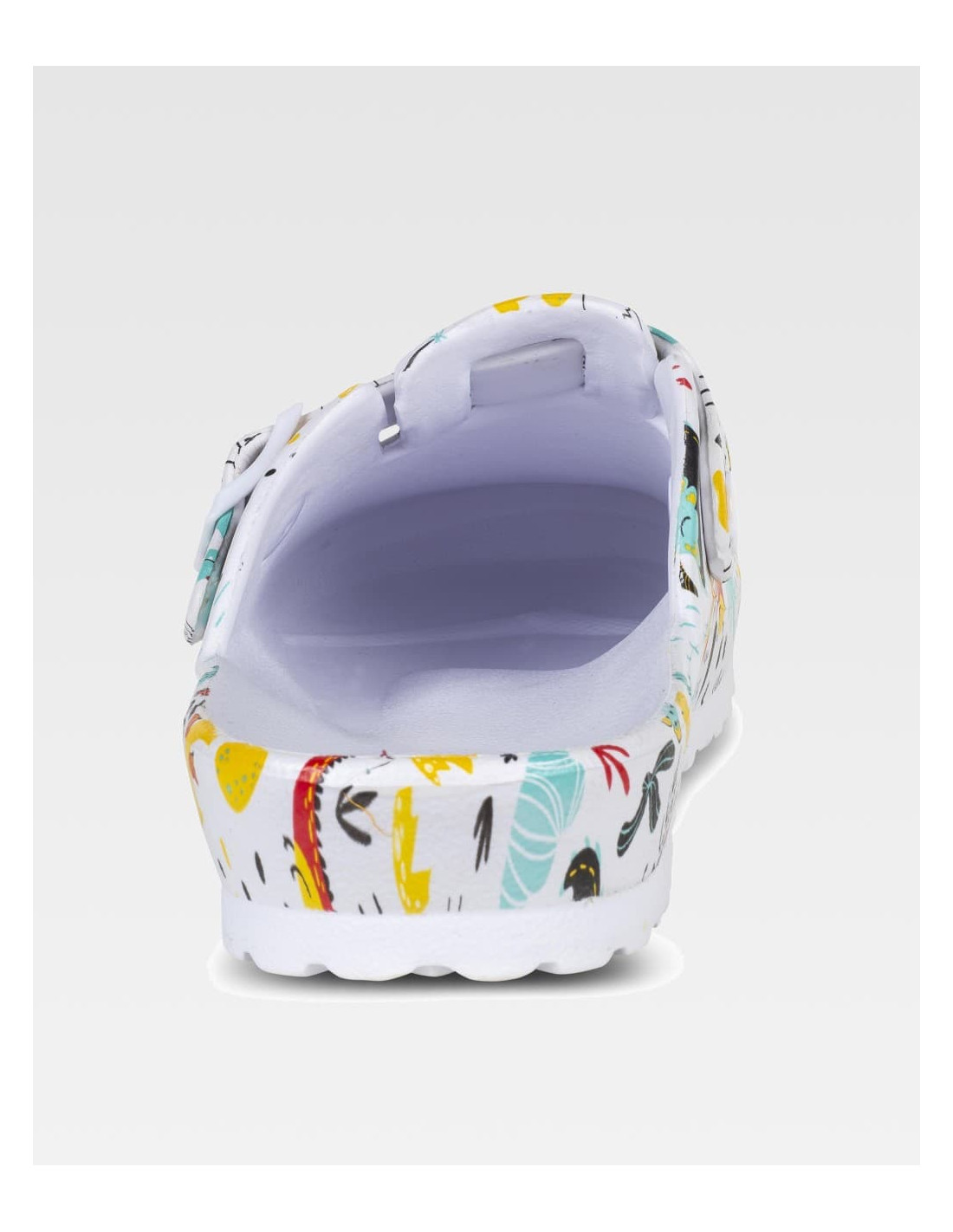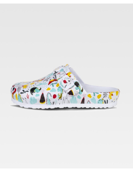 Zueco estampado ultraligero de EVA con hebilla ajustable en el empeine. Ergonómico y anatómico, con cámara ortopédica. Resistente a los tropiezos y suave para los pies.