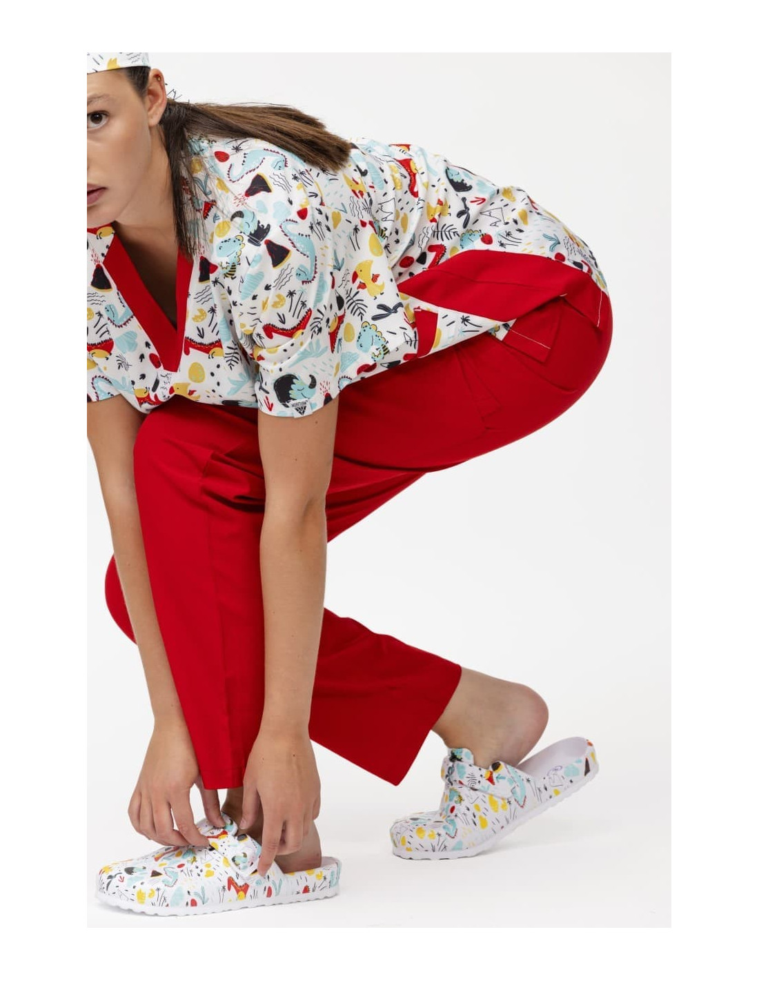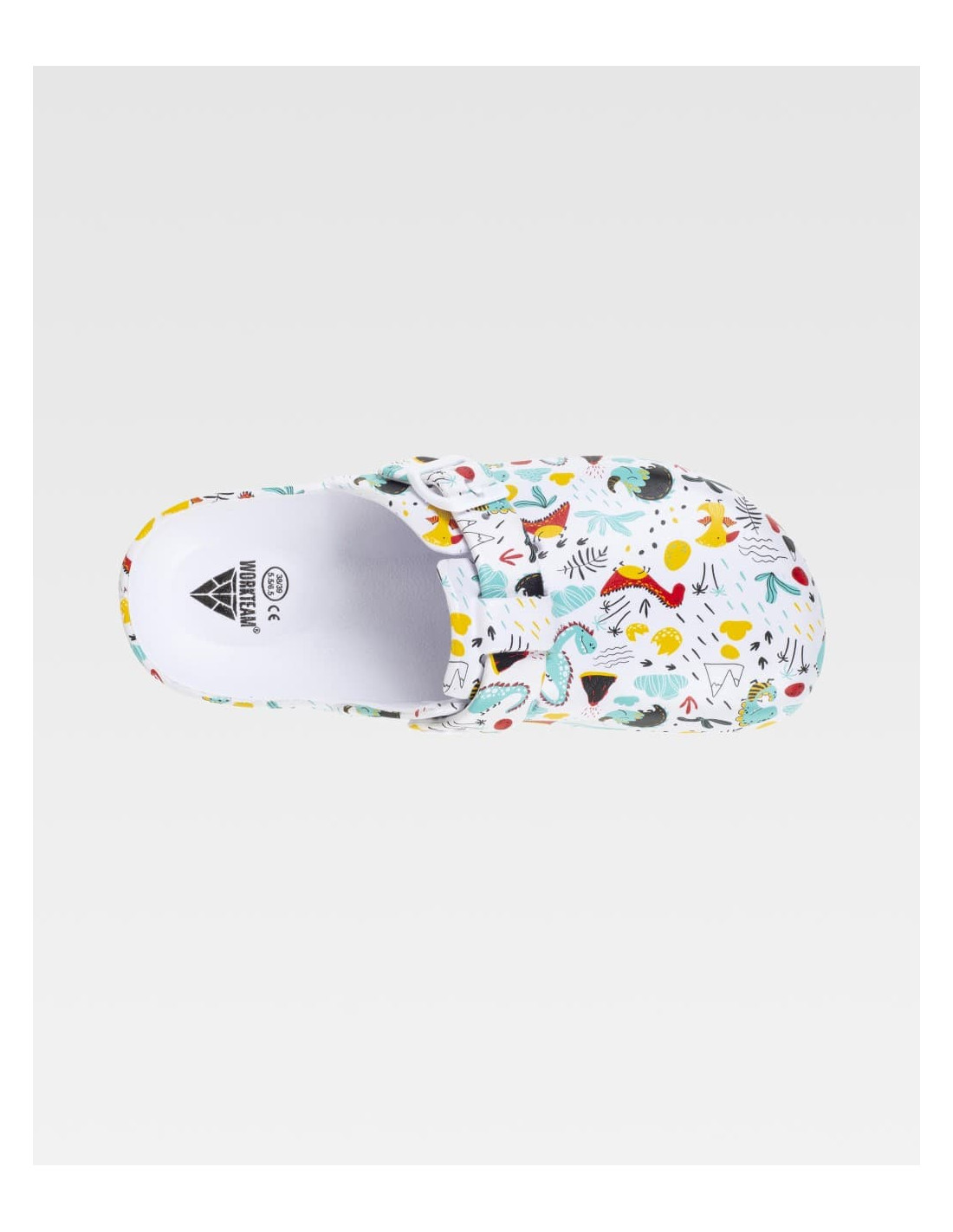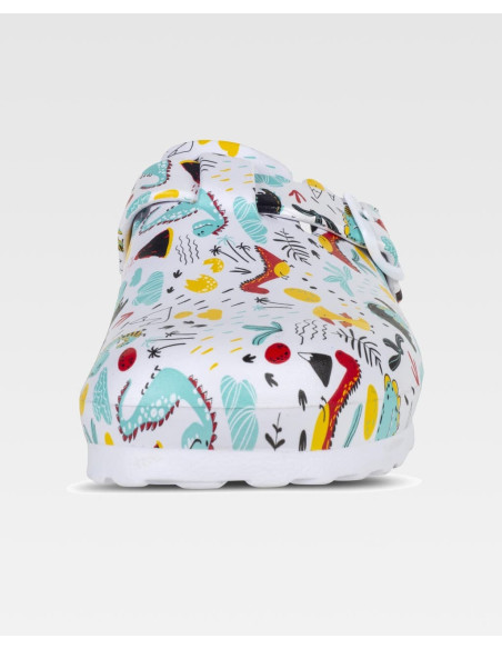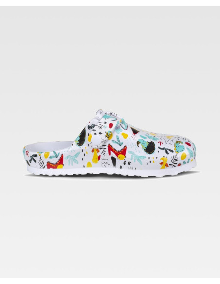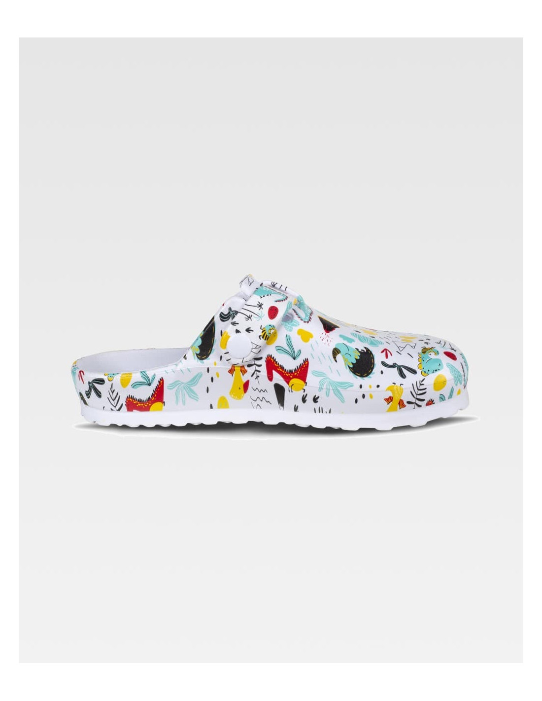 Zueco estampado ultraligero de EVA con hebilla ajustable en el empeine. Ergonómico y anatómico, con cámara ortopédica. Resistente a los tropiezos y suave para los pies.