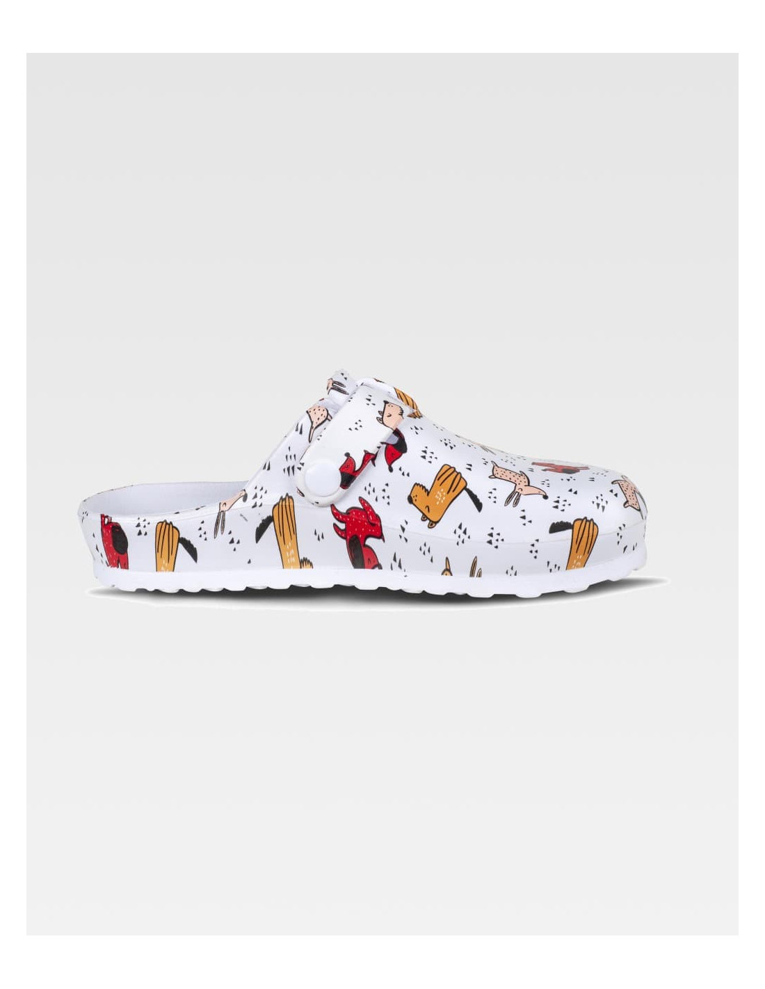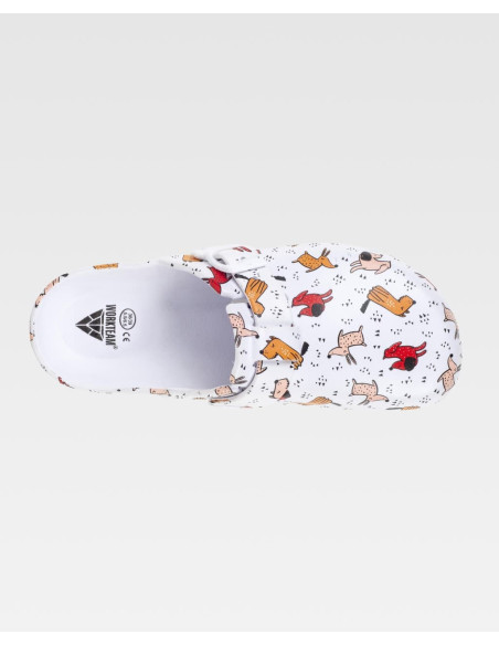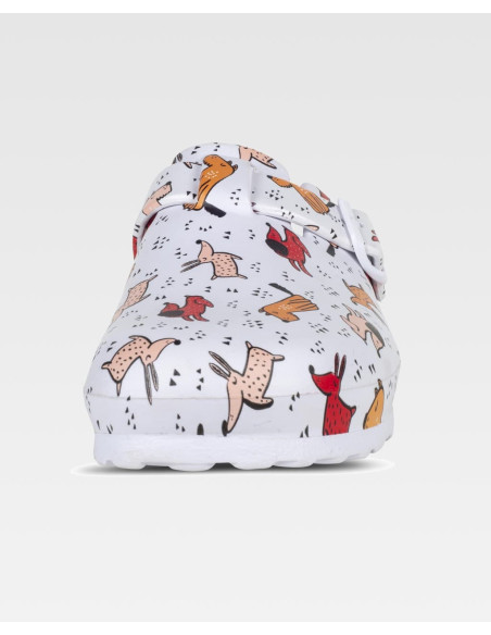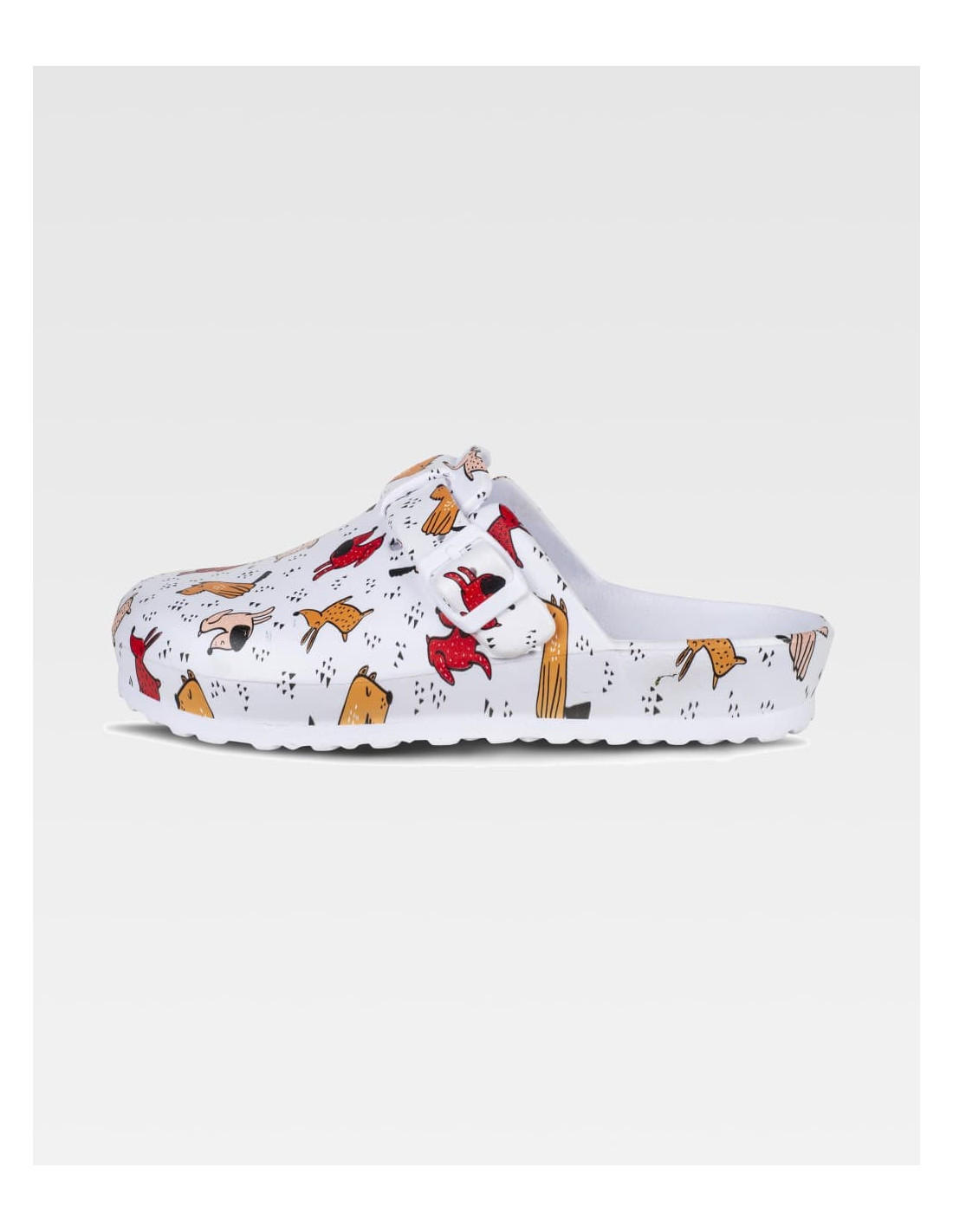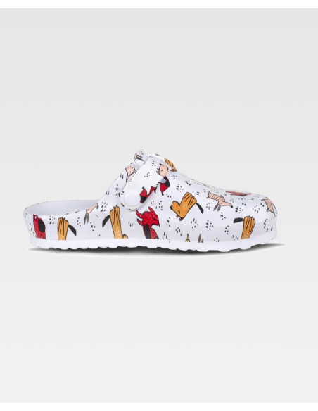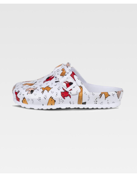 Zueco estampado ultraligero de EVA con hebilla ajustable en el empeine. Ergonómico y anatómico, con cámara ortopédica. Resistente a los tropiezos y suave para los pies.