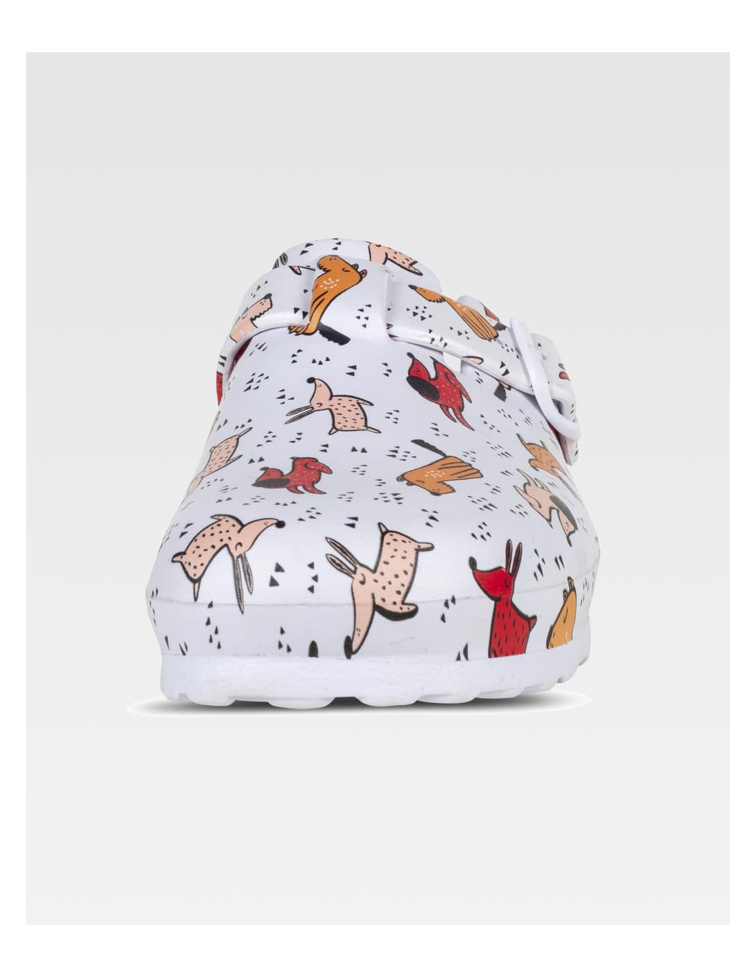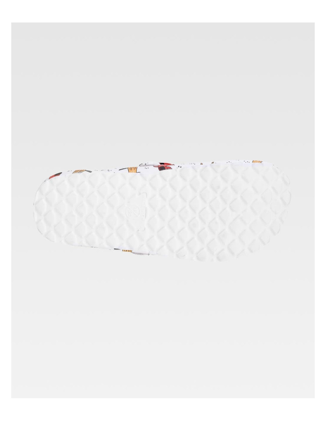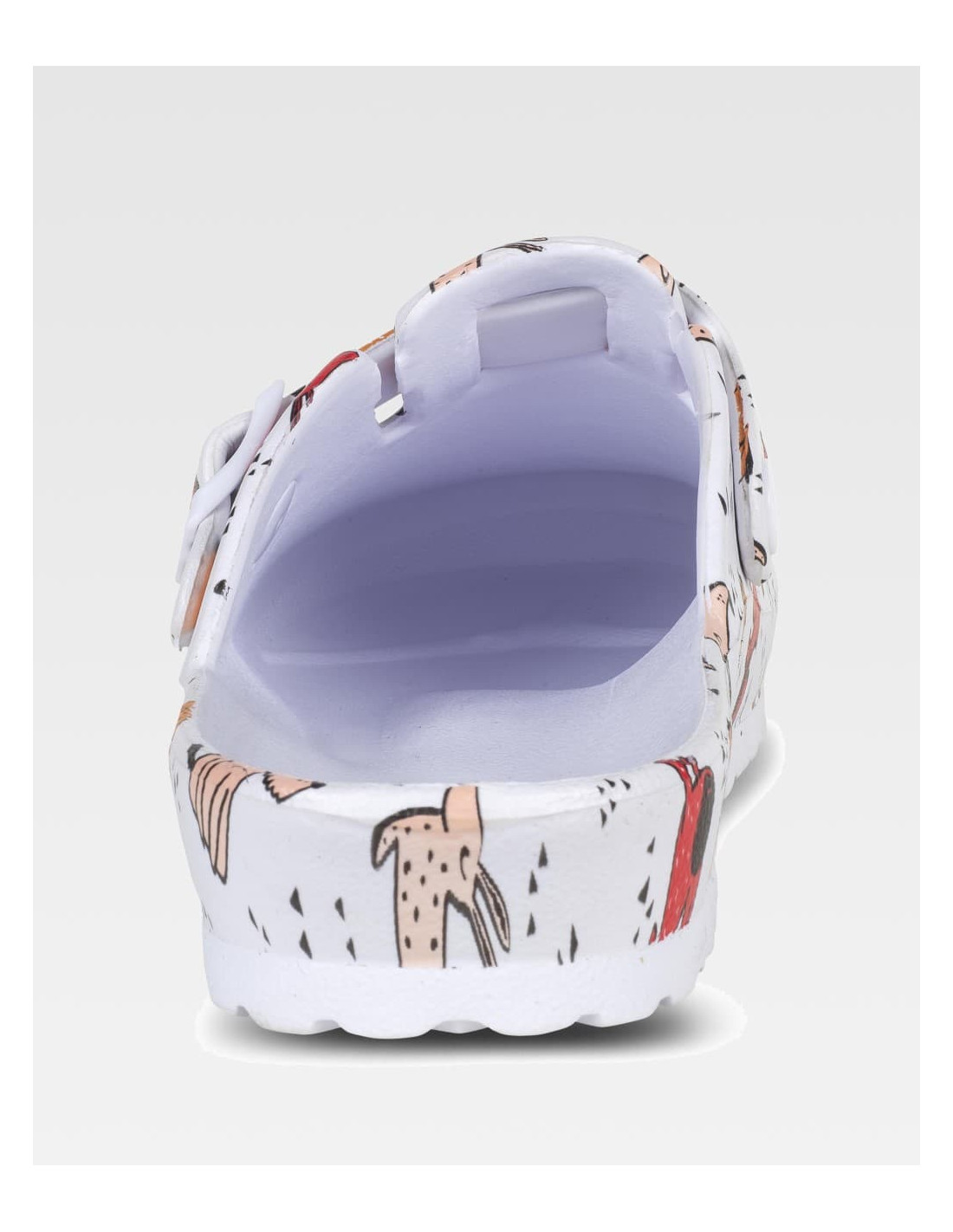 Zueco estampado ultraligero de EVA con hebilla ajustable en el empeine. Ergonómico y anatómico, con cámara ortopédica. Resistente a los tropiezos y suave para los pies.
